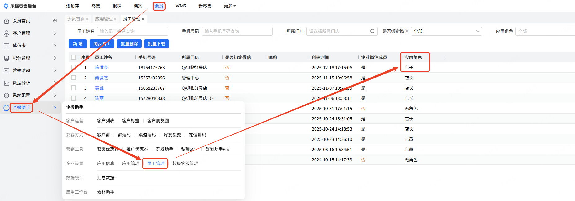 并确保需要进入助手的用户角色为店长,确保用户在企微后台已经将此用户添加到助手的可见范围中
