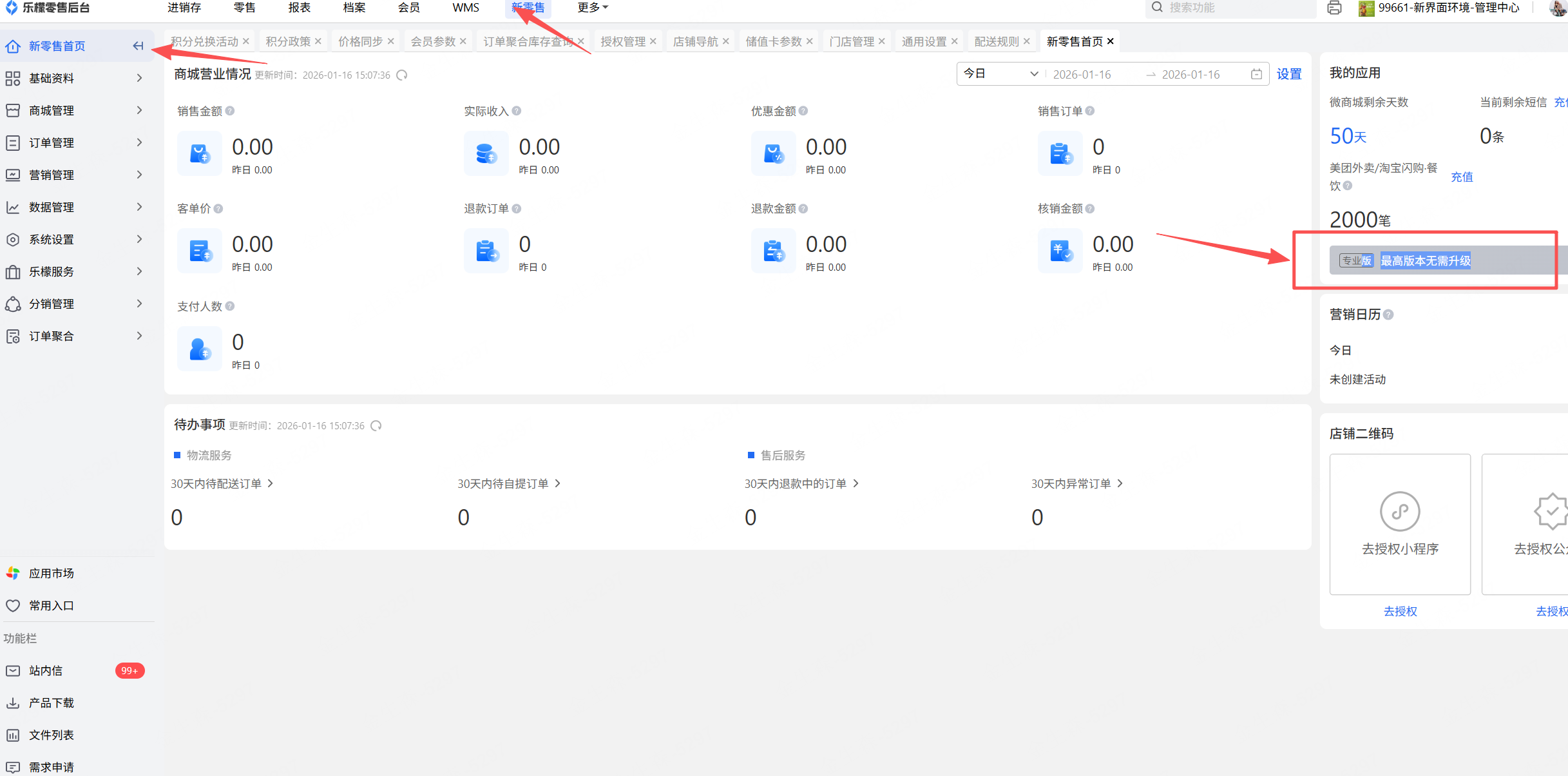 1、商家未购买新零售系统版本,无法使用商城小程序相关功能。(可在新零售首页-右侧我的应用查看乐檬系统是否购买新零售版本)