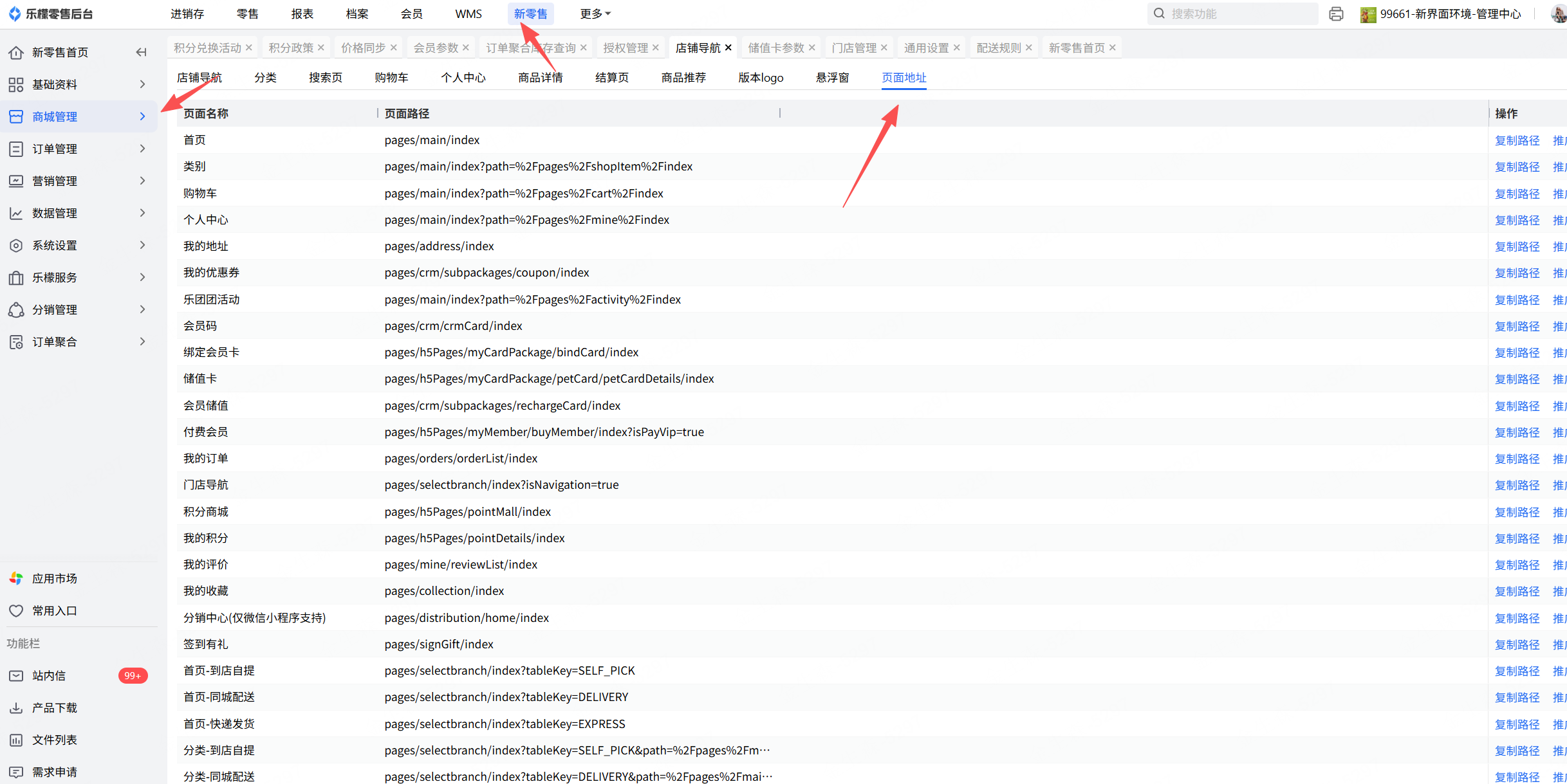 2、但是商家在公众号后台自定义菜单栏里放置跳转的小程序链接是商城小程序的地址链接,所以点击链接跳转打不开(商城小程序地址链接可在新零售-商城管理-店铺导航-页面地址里查看)