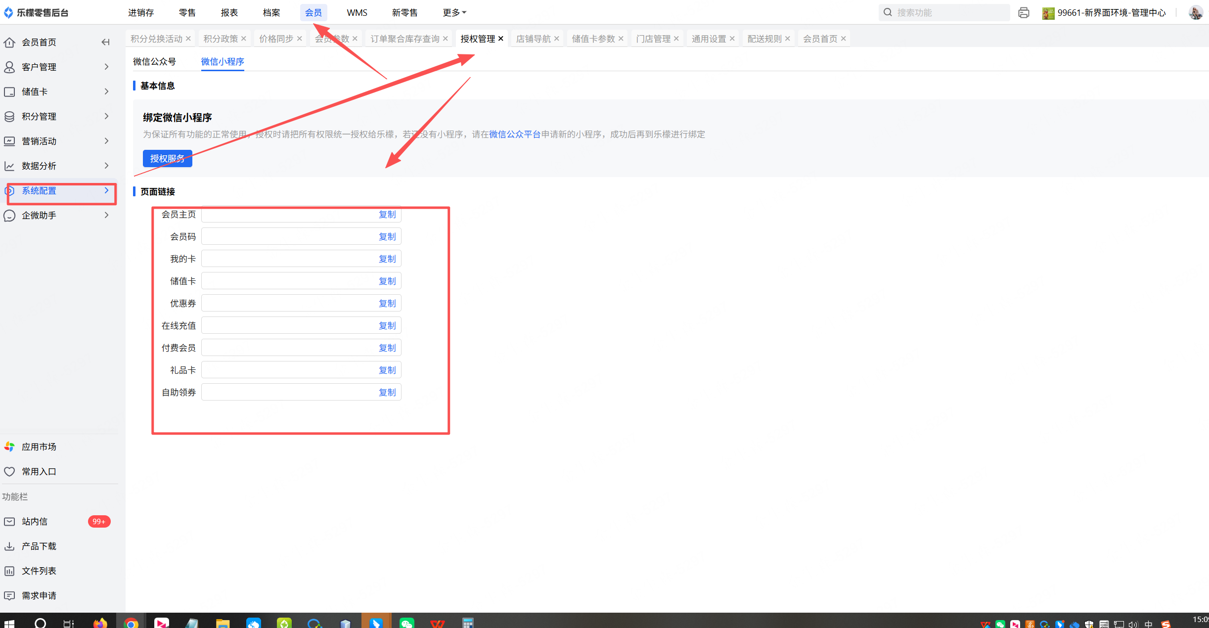 3、商家未购买新零售系统版本,小程序只能用来作为会员小程序使用,公众号菜单栏放置的会员小程序跳转链接可以在会员-系统配置-授权管理-微信小程序-页面地址获取