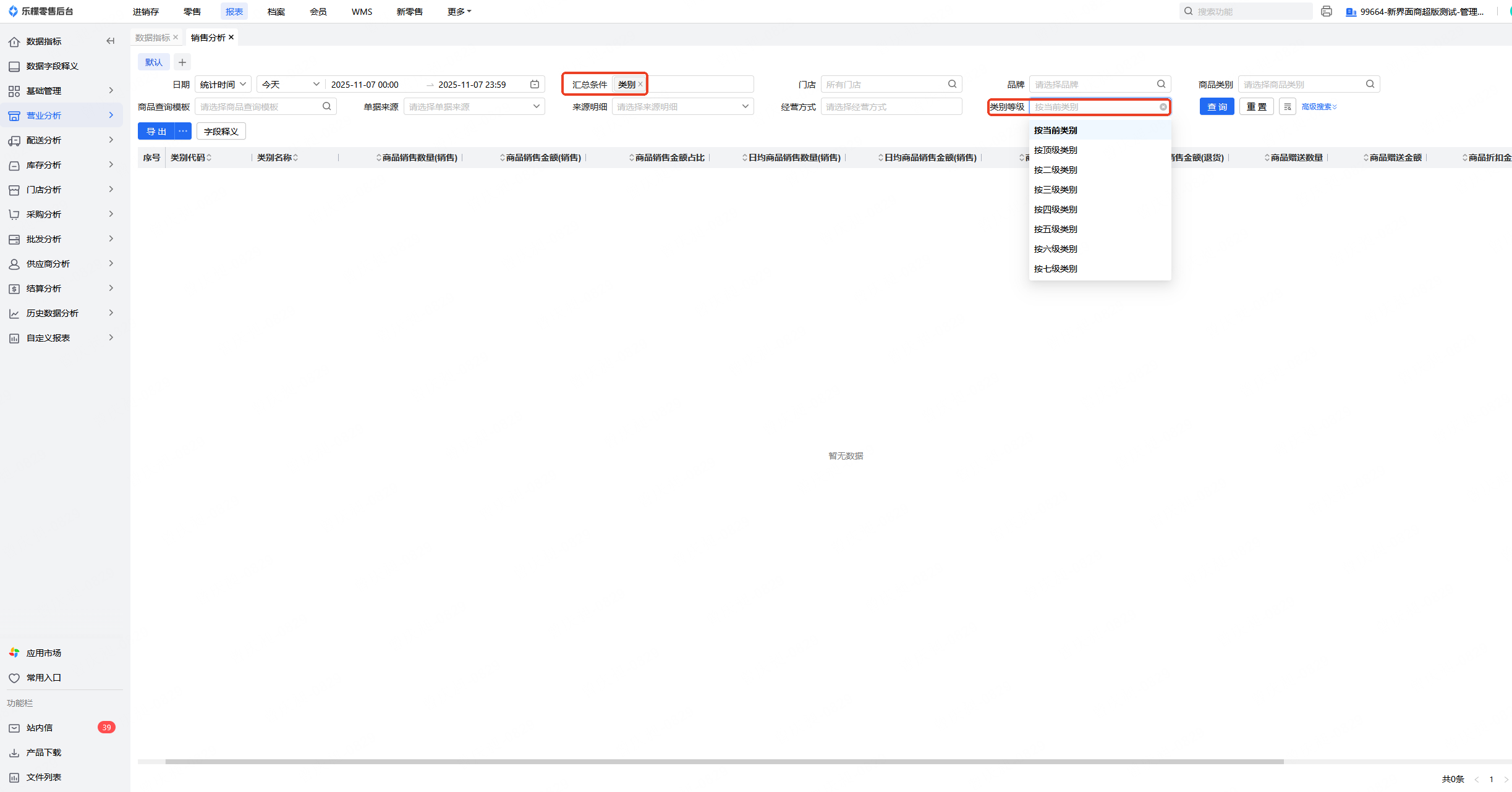 进入后,先把汇总条件改为:类别; 再去选择对应的分类等级(一级分类、二级分类、三级分类等最多七级)