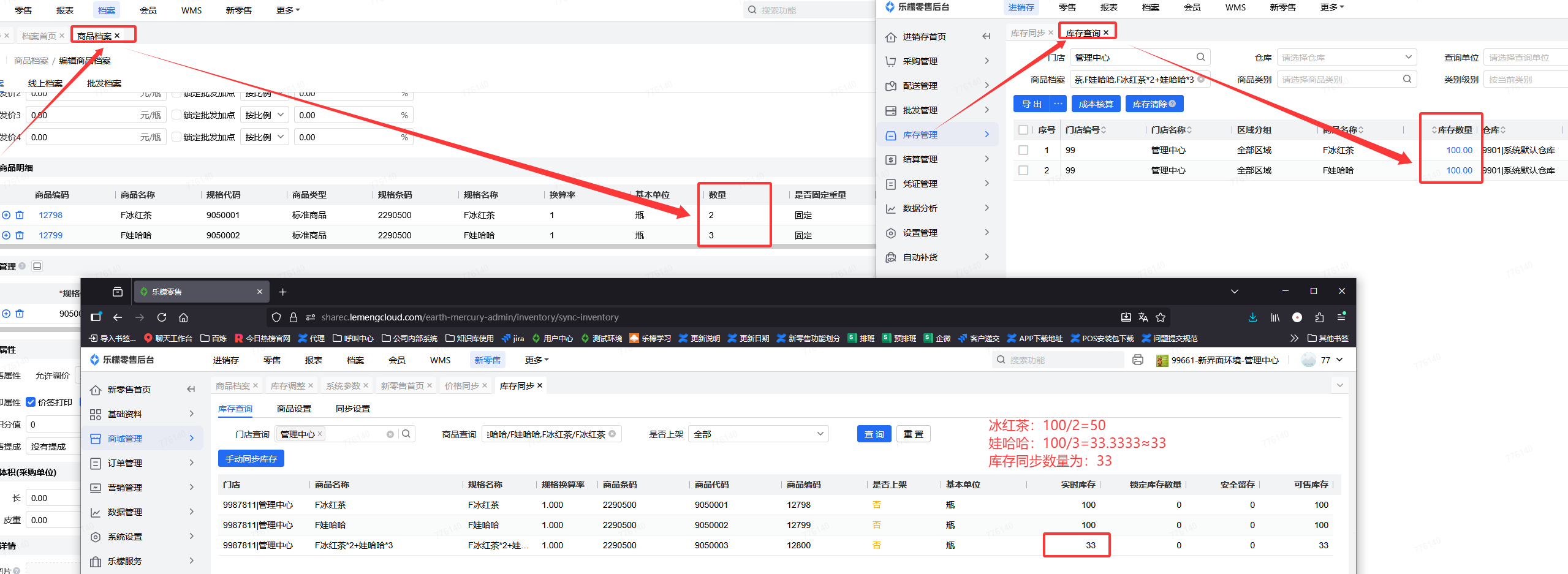 明细商品C(标准)换算率数量3,C库存100——可同步值:100/3=33.3333 。所以最终同步给线上的A商品的库存=33.3333
