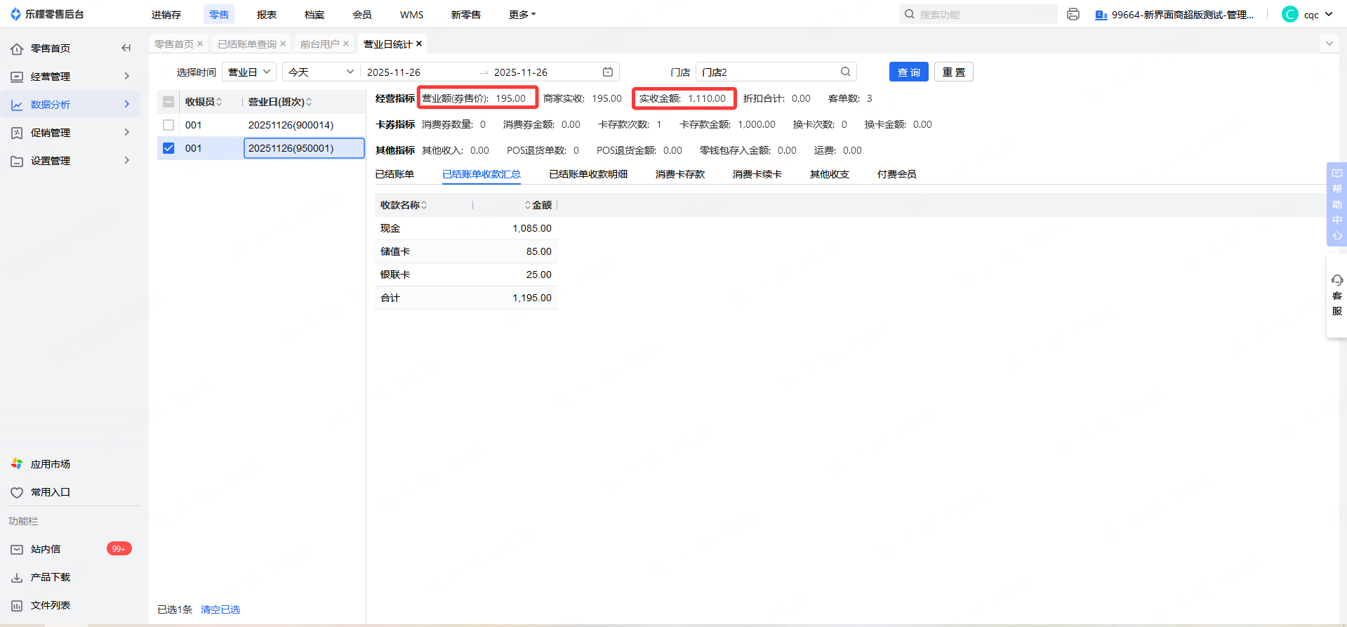 👉【操作路径】:零售-数据分析-营业统计-已结账单查询