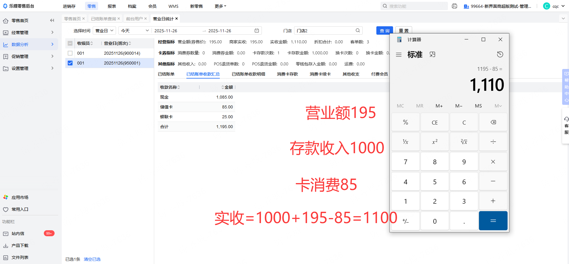 实收金额=营业额+卡存款-卡消费