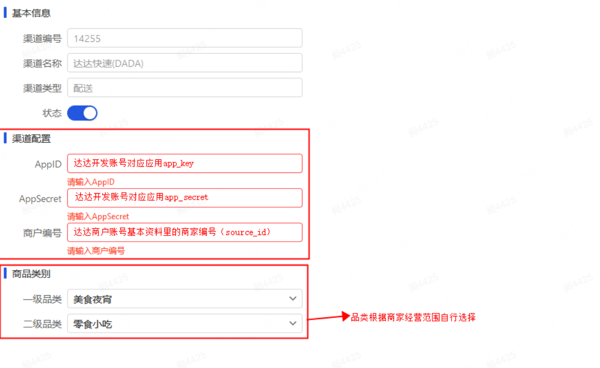 6、登录乐檬系统后台,在配送聚合模块-渠道-渠道列表-选择达达配送,渠道配置里AppID和AppSecret对应步骤5里面的达达app_key和app_secret,商户编号对应步骤3里的达达商户编号(source_id),商品类别可以根据商家经营范围自行选择设置。