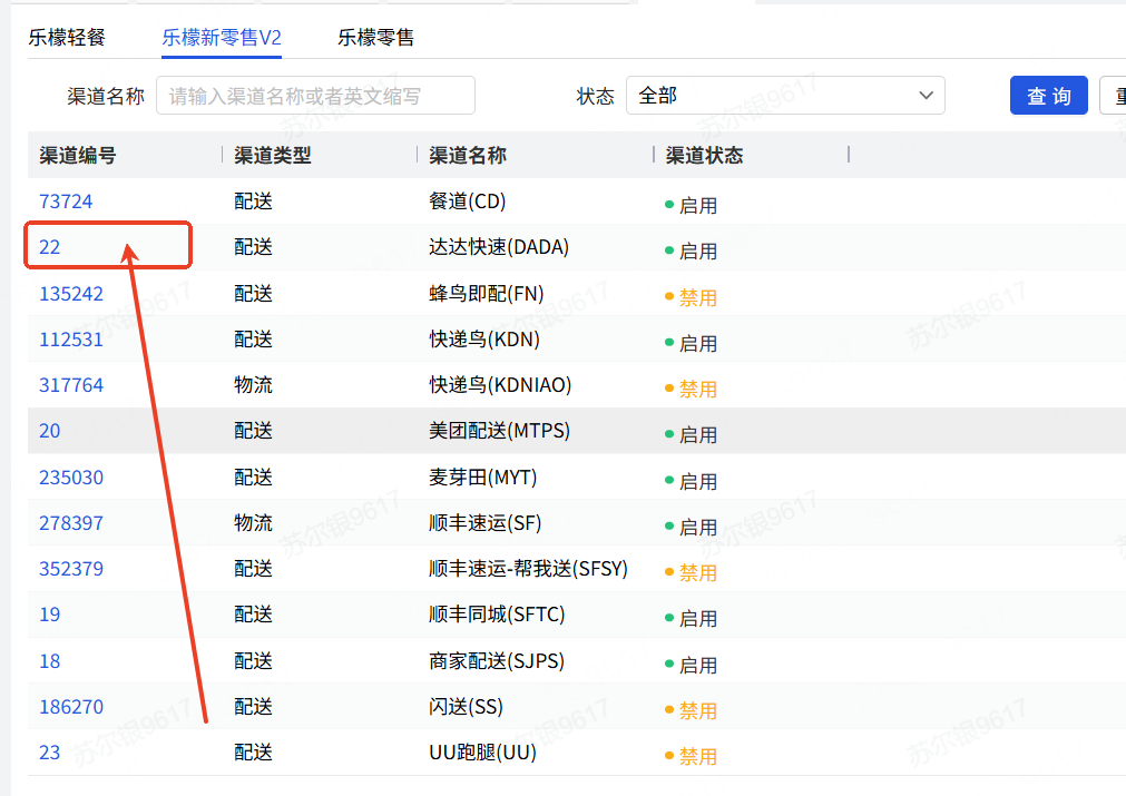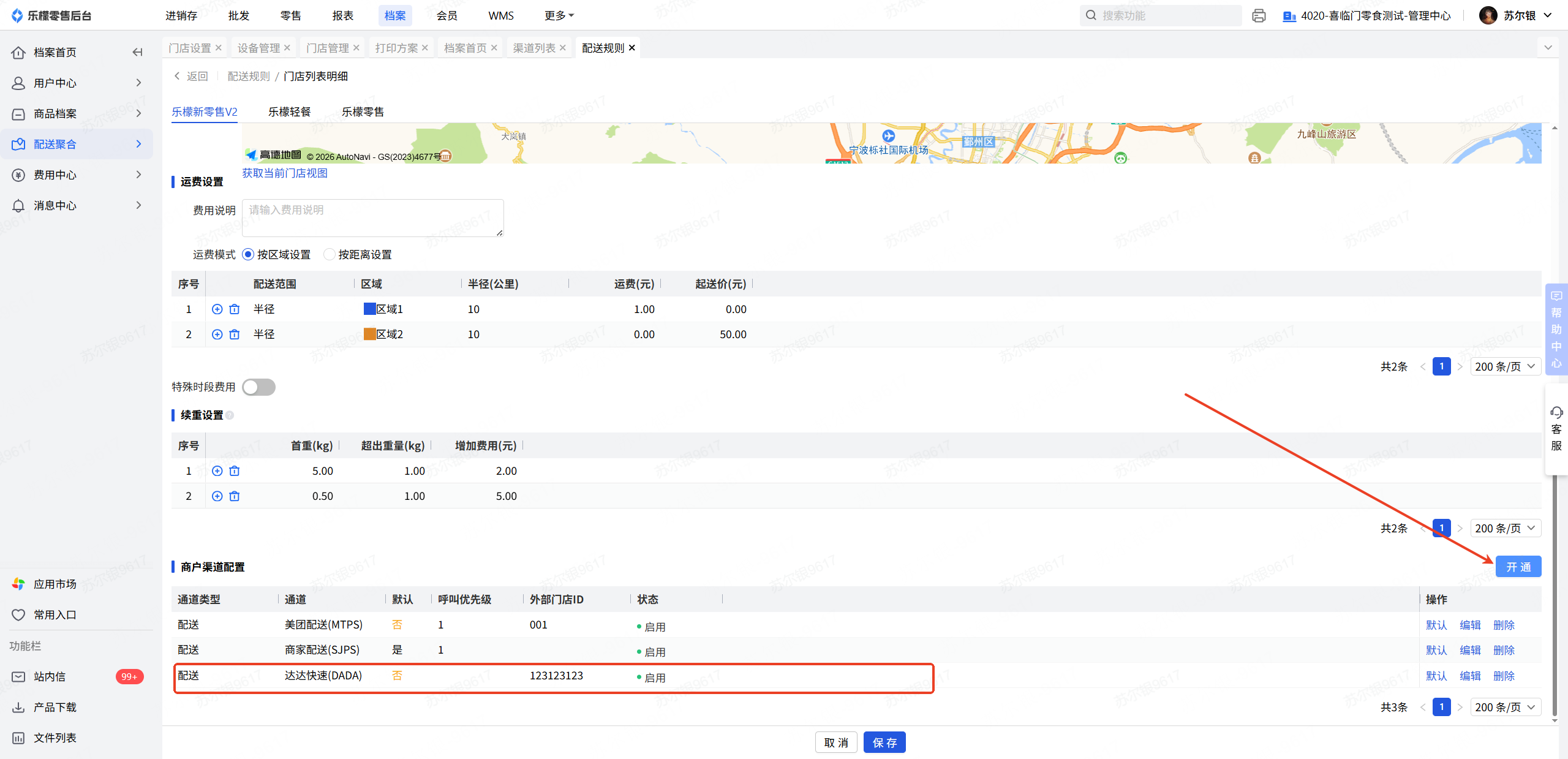 10、乐檬系统后台,在配送聚合模块-档案-配送规则-选择对应门店,进入对应门店后最下方商户渠道配置-开通进行配置,达达店铺ID填写步骤9中达达商户中心-门店管理里对应的门店编号