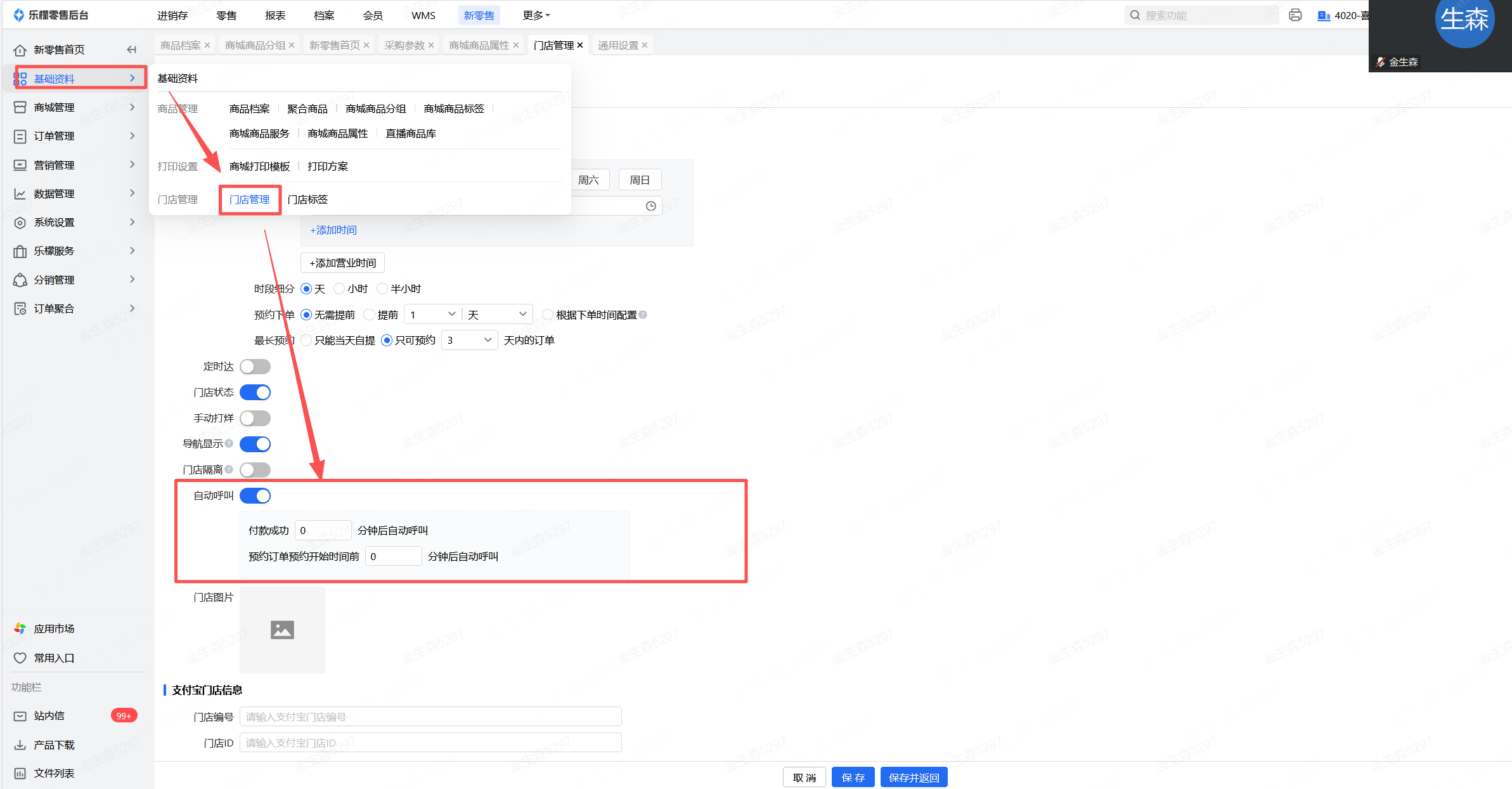 👉【操作路径】:新零售-基础资料-门店管理,选择对应门店编辑,开启自动呼叫开关