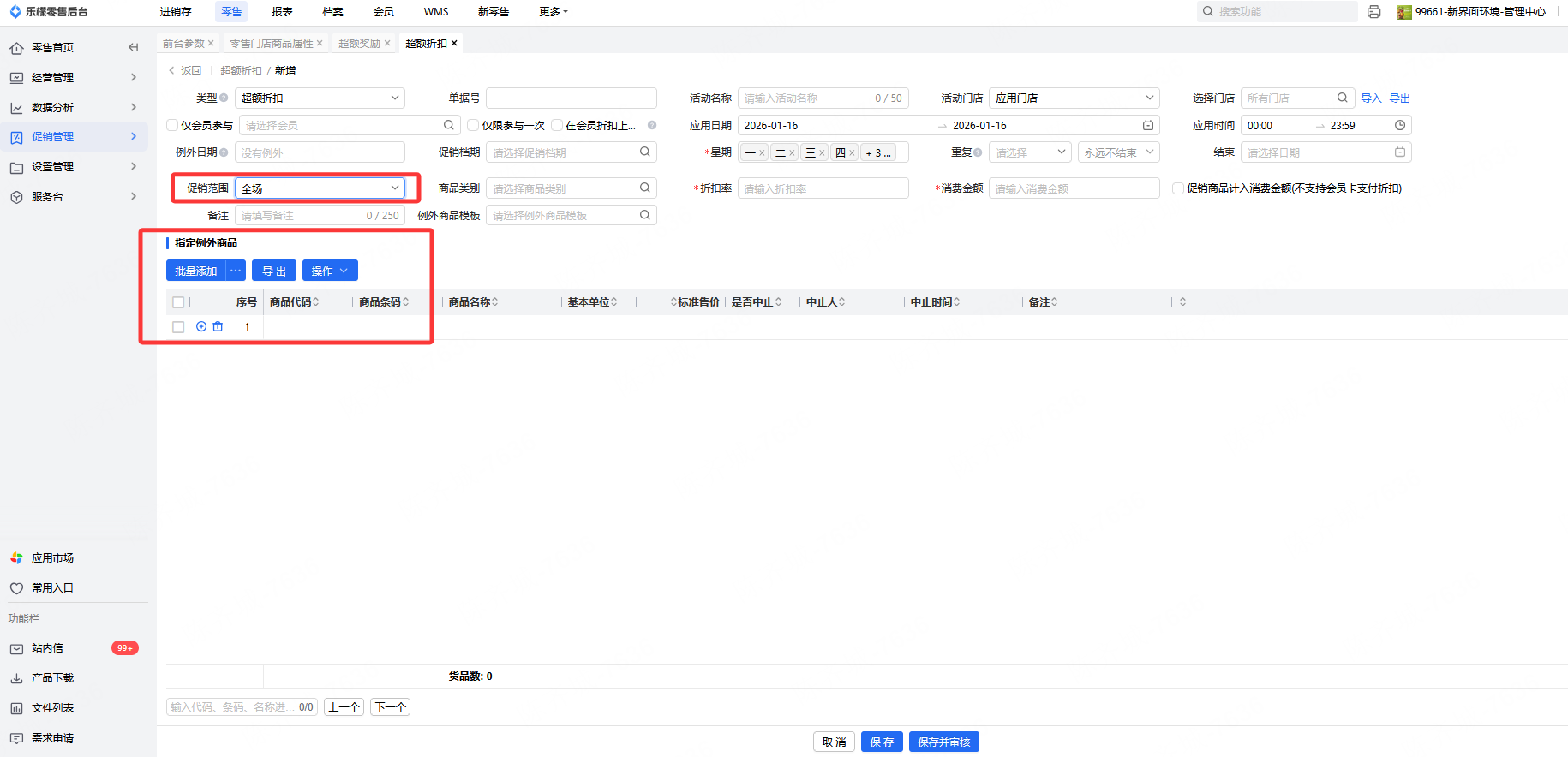 2.促销的商品范围是否选择正确,选择了全场后下面添加的就是例外商品了 不参与活动的