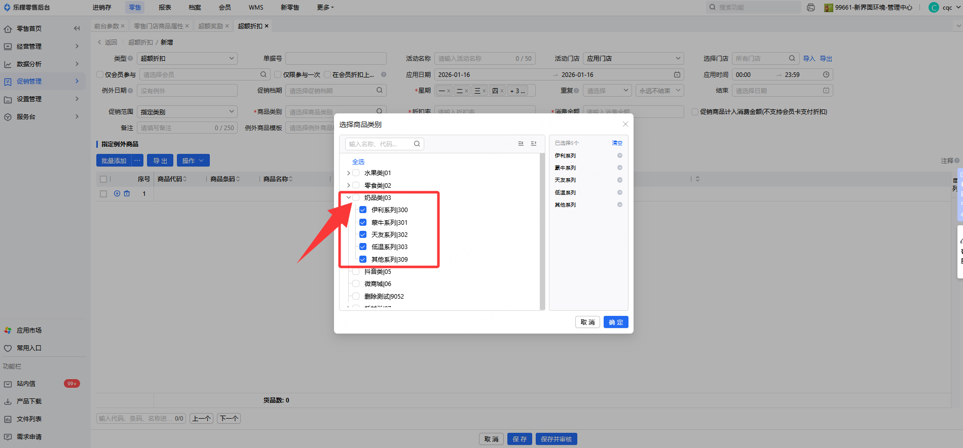 4.超额折扣里面促销范围选择大类的小类别,显示大类别已选择,但是其实是没有选择的。