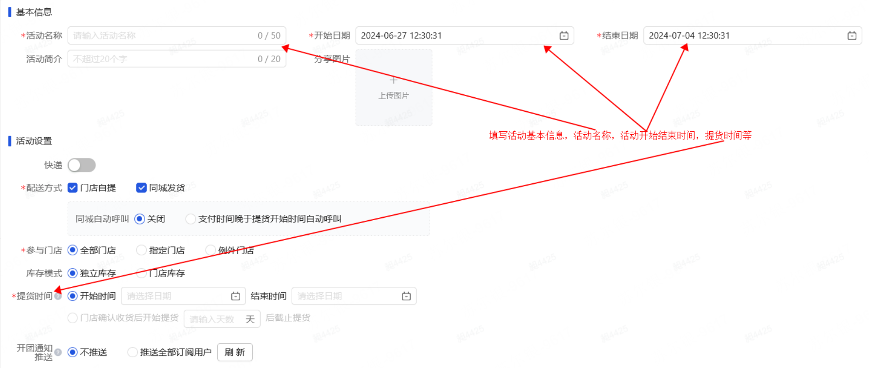 1、填写乐团团活动的基本信息(活动名称、活动时间以及提货时间等),设置乐团团的配送方式、参与门店、库存等