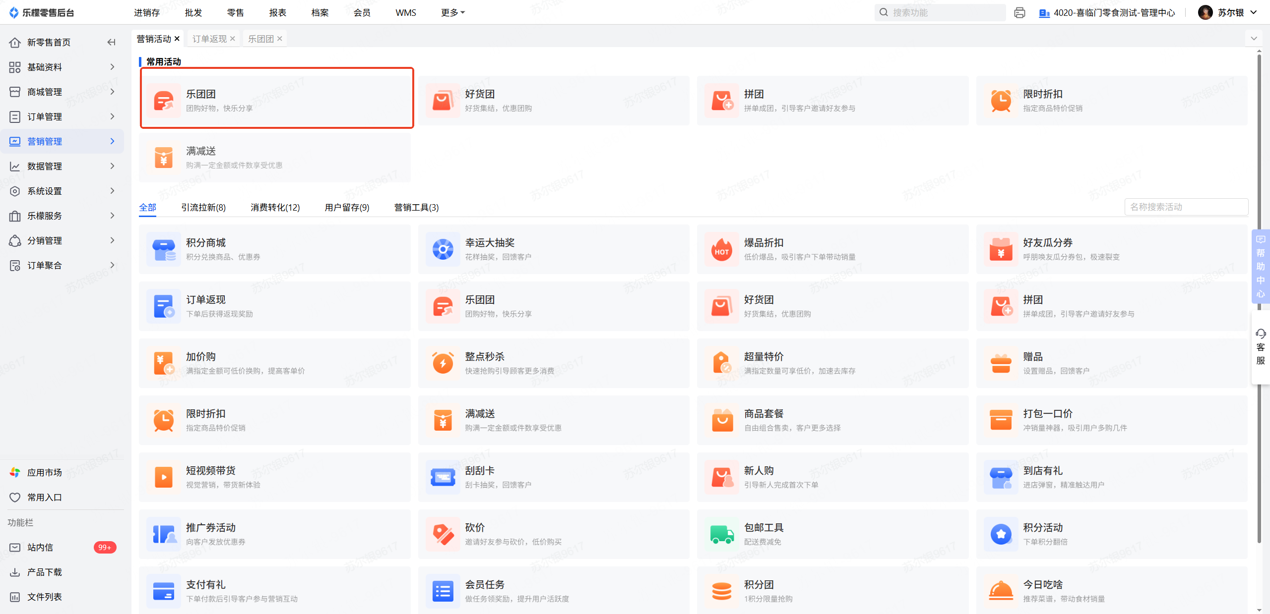 👉【操作路径】:新零售-营销管理-营销活动-乐团团-点击【新增】按钮