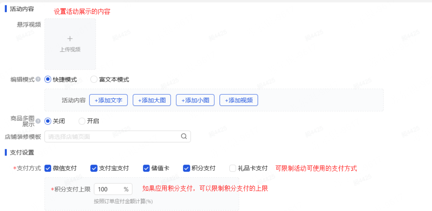 活动限购 - 默认为空,表示不限制;填入后则下单总数量有上限(针对活动,与门店无关)