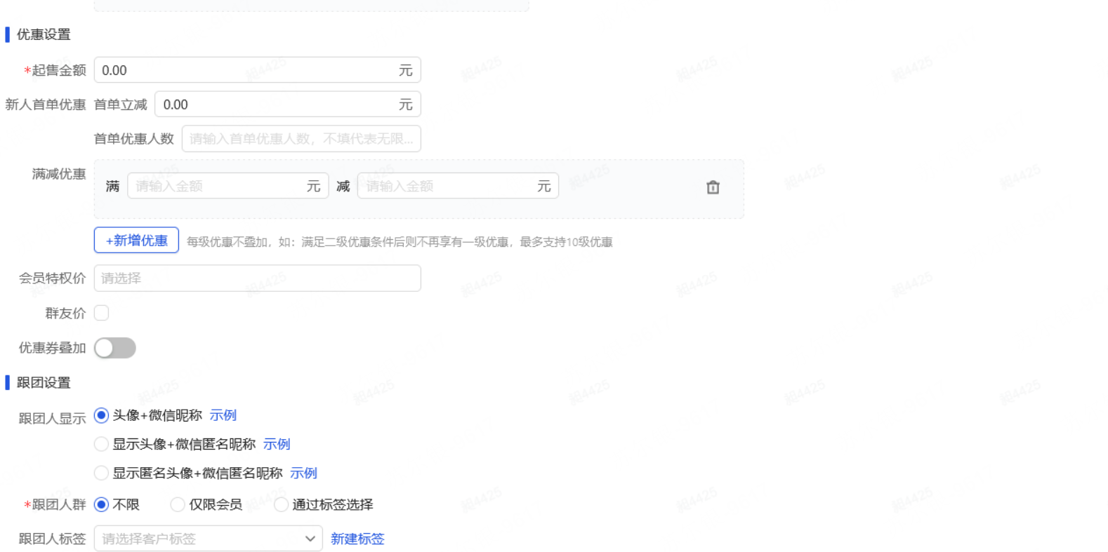 新人首单优惠 - 填写首单立减、优惠人数;(小程序的端应用:即前几名新人购买可享受无门槛立)