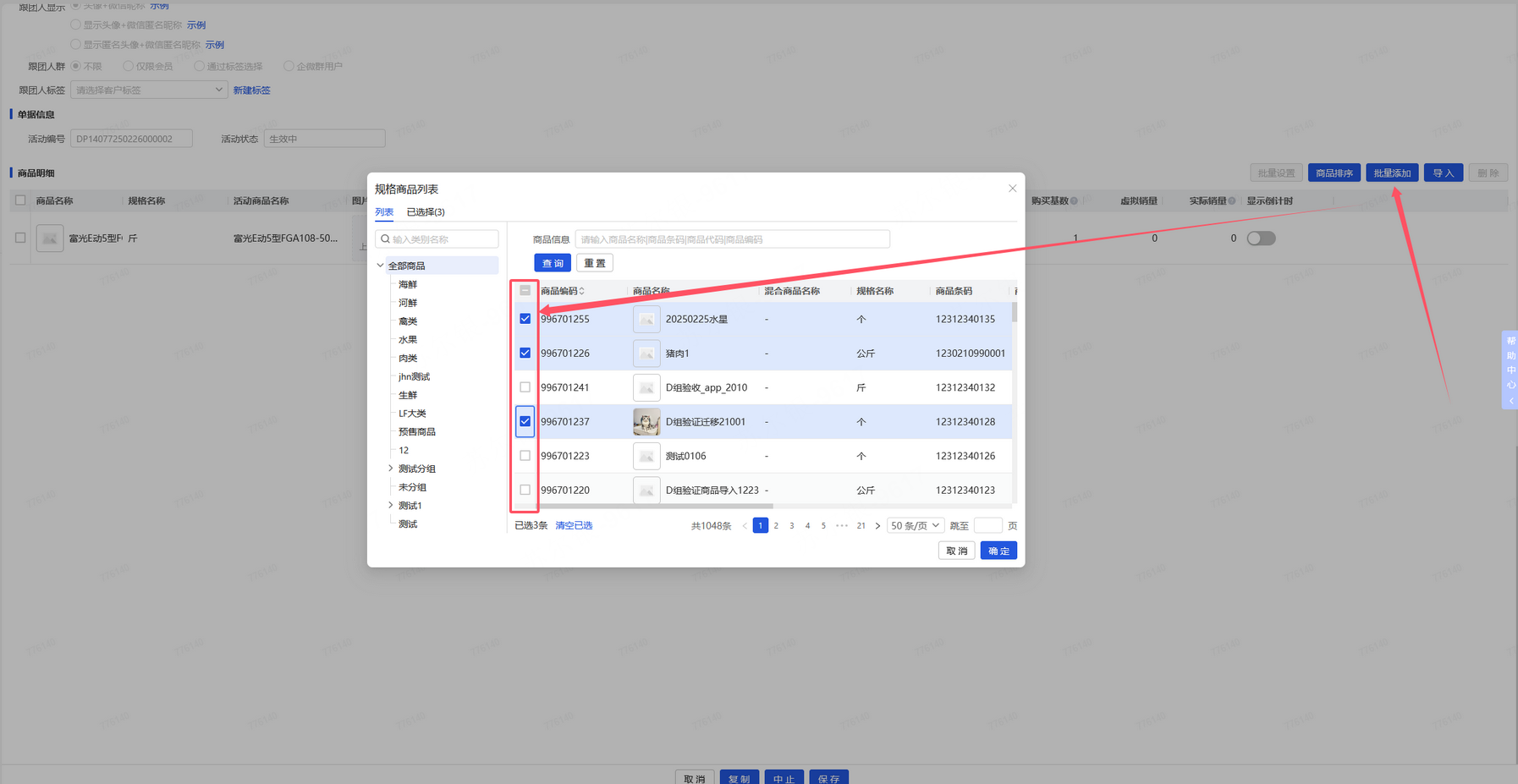 👉【操作路径】:6.切换tab到活动商品,点击新增商品跳转选择商品页面 - 7.设置乐团团活动商品的活动价及限购等 - 8.点击保存