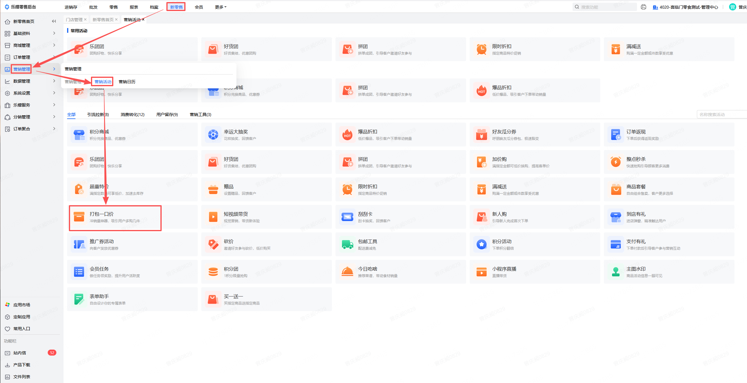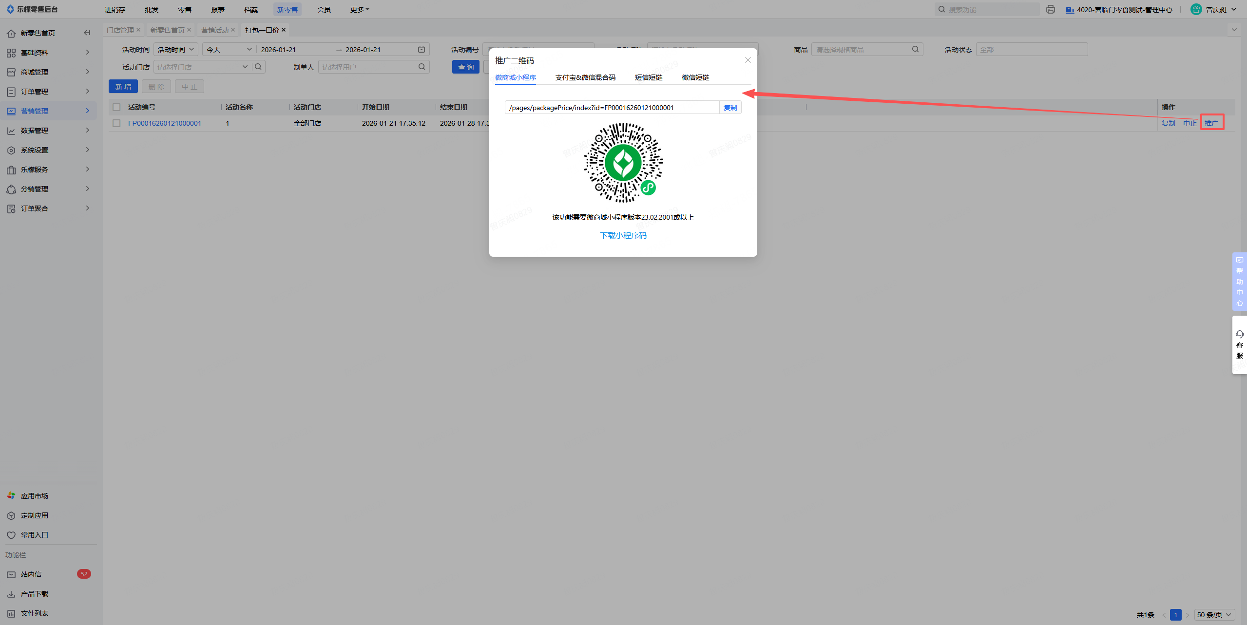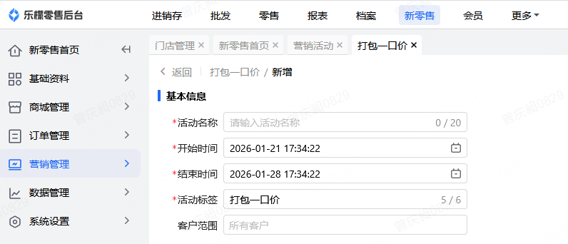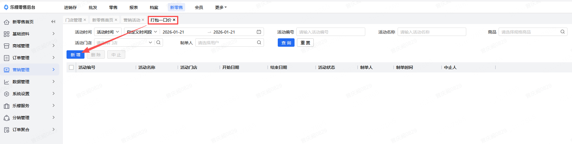 👉【web操作路径】:新零售-营销管理-营销活动-打包一口价-点击【新增】按钮