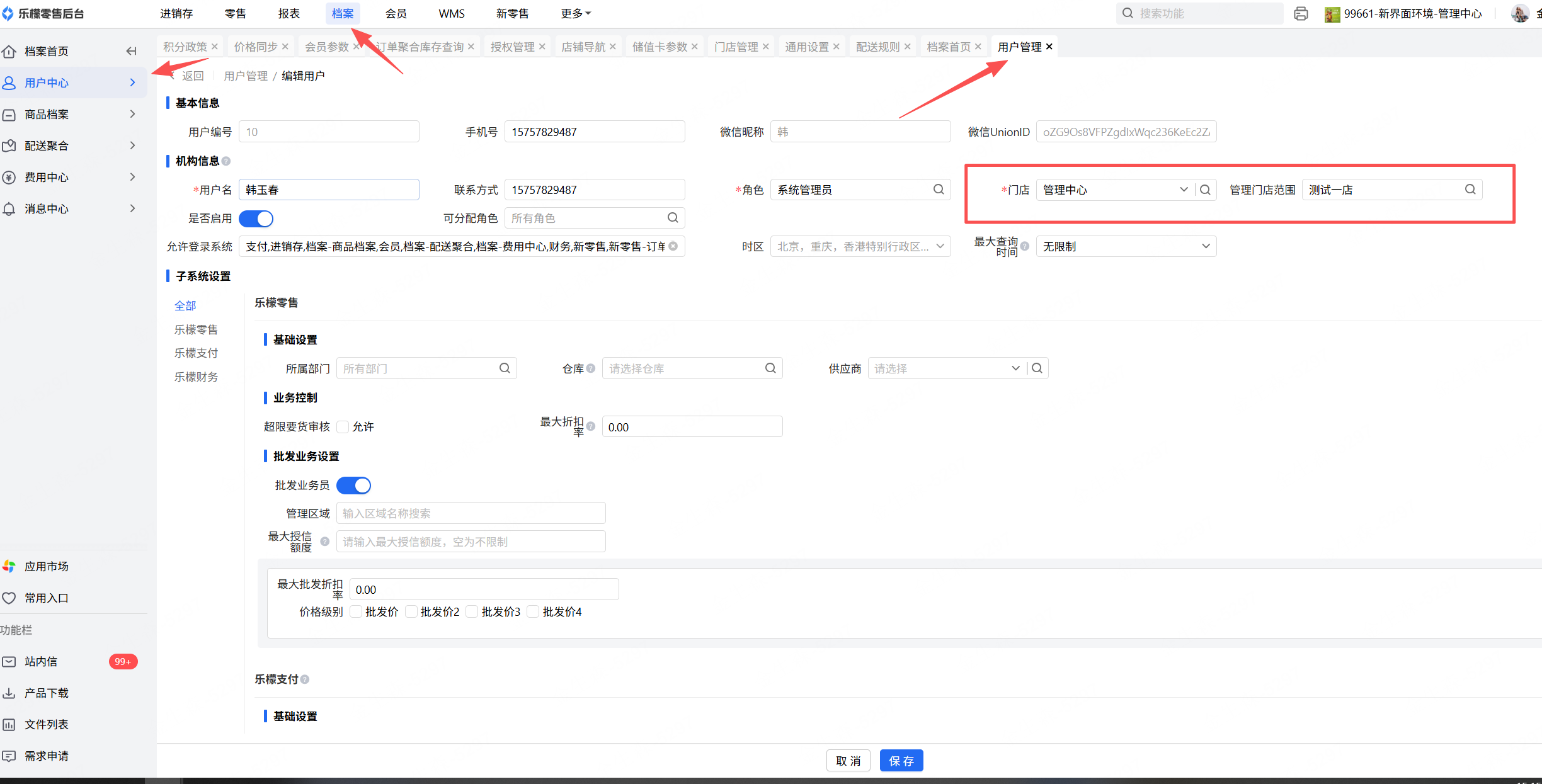 用户档案配置 | 对应用户的所属门店、门店范围需要与下单门店一致才可以接收到对应门店的信息 | |