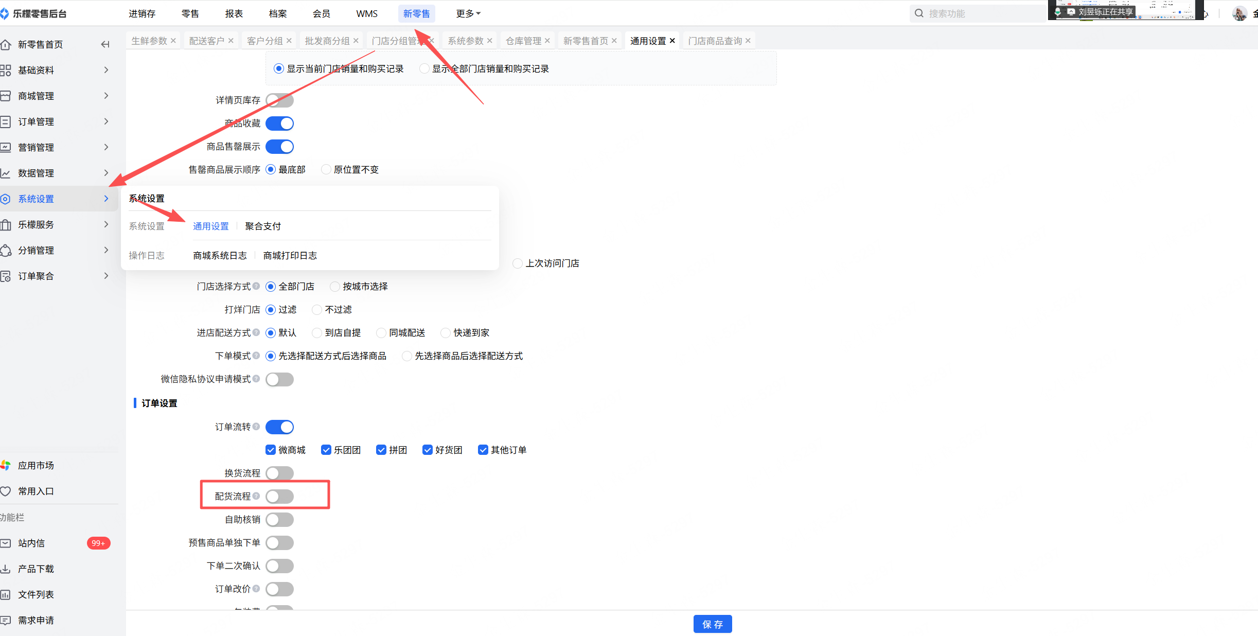 商家新零售-系统设置-通用设置-订单设置,开启了配货流程,该顾客订单处理待配货状态,所以前台找不到订单无法核销发货