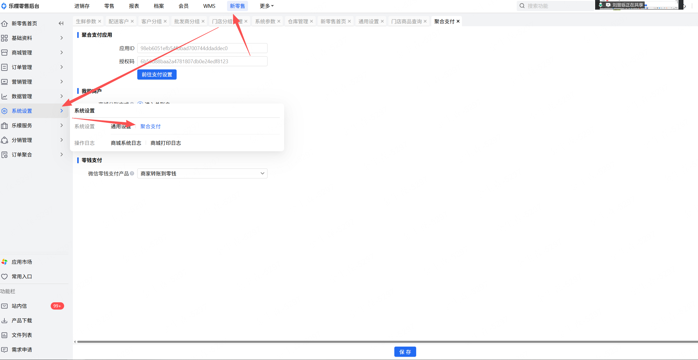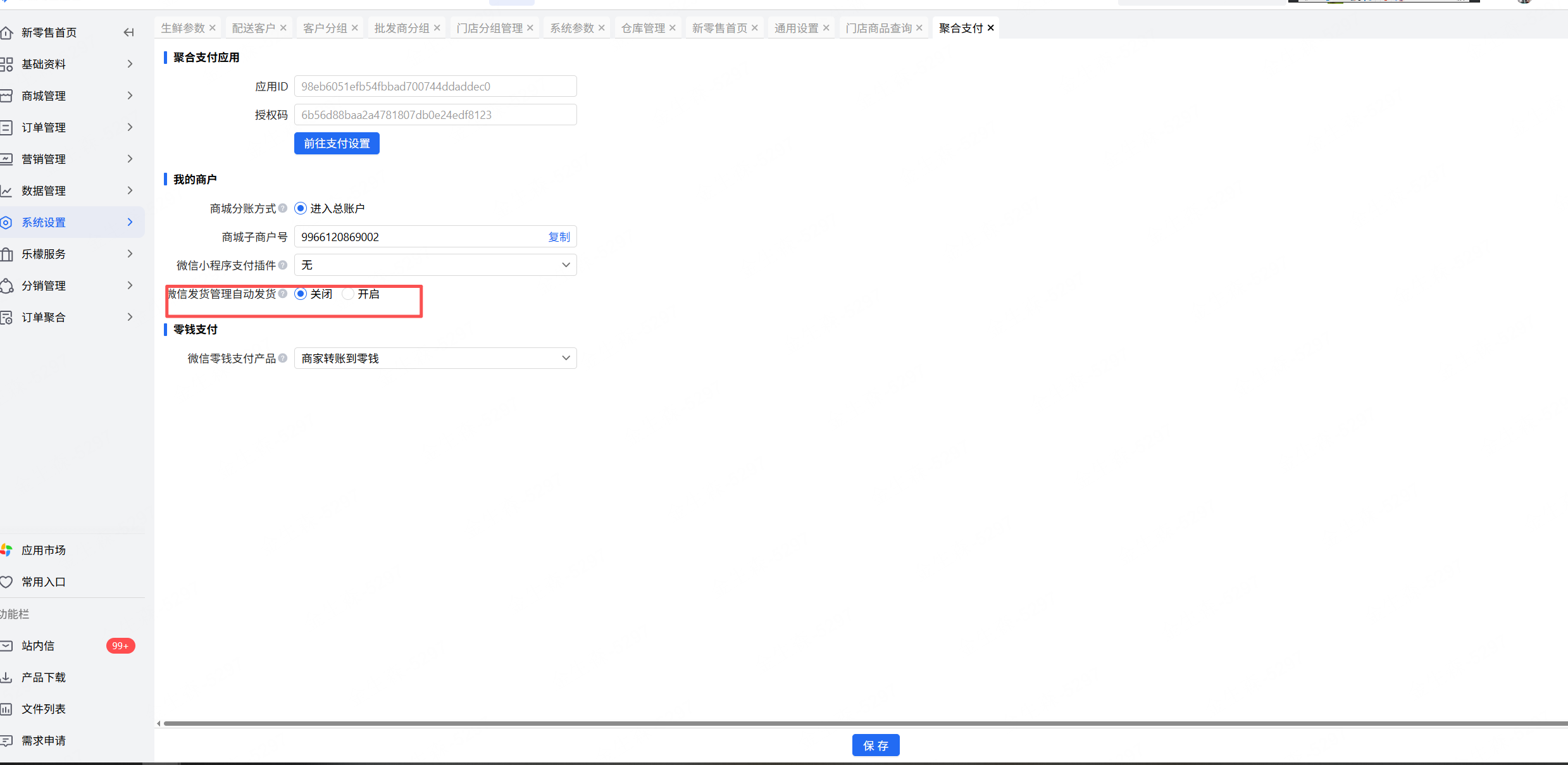 👉【操作路径】:新零售-系统设置-聚合支付,开启微信发货管理自动发货功能