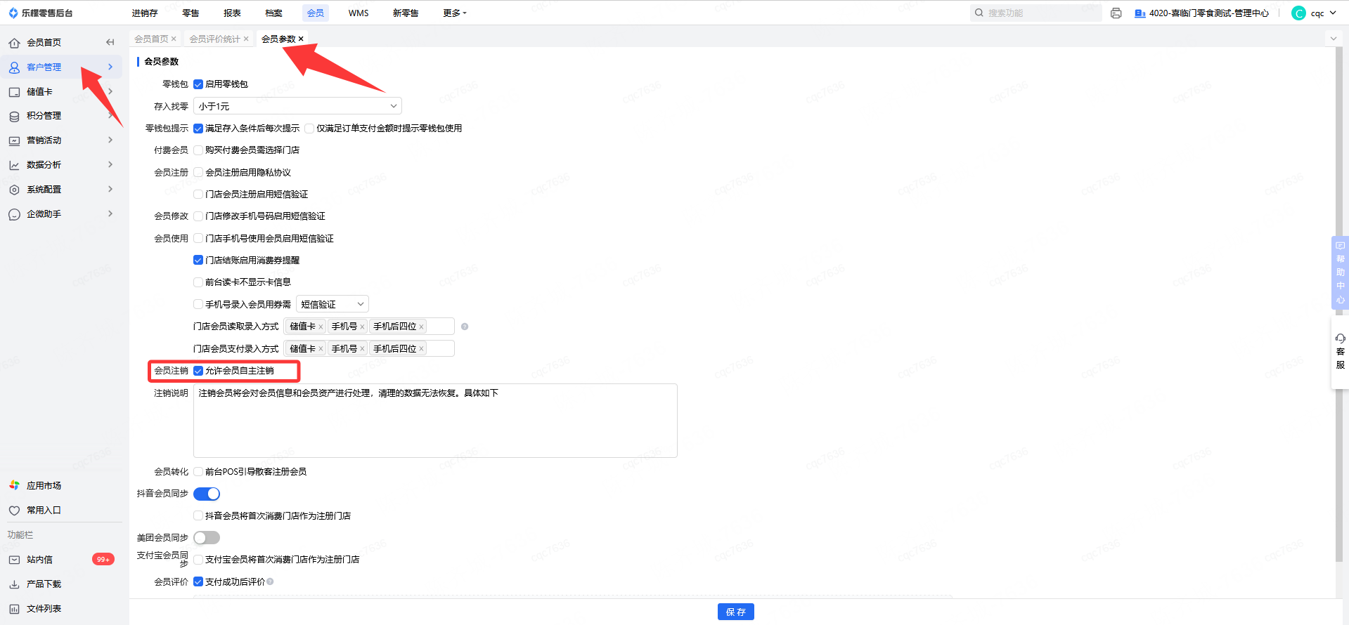 👉【操作路径】:会员-客户管理-会员设置-会员参数,取消勾选【允许会员自主注销】参数