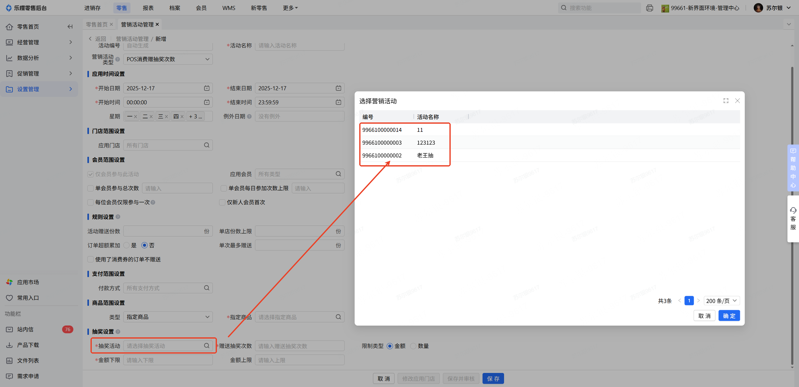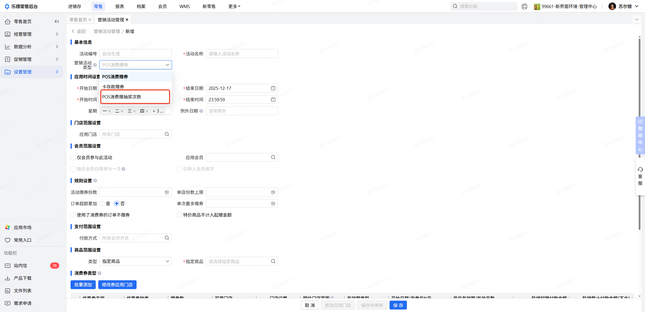 新增活动界面营销活动类型选择“POS消费赠送抽奖次数”