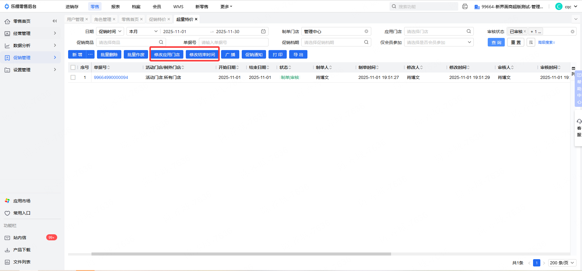 对于已审核的超量特价活动,只可修改应用门店和结束时间