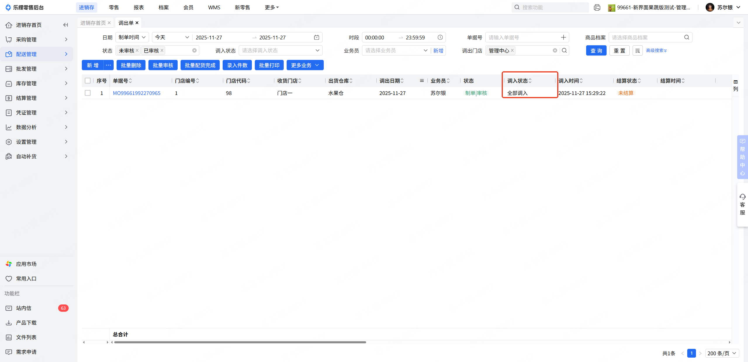 未调入:调出单生成的调入单,未审核;或为生成调入单