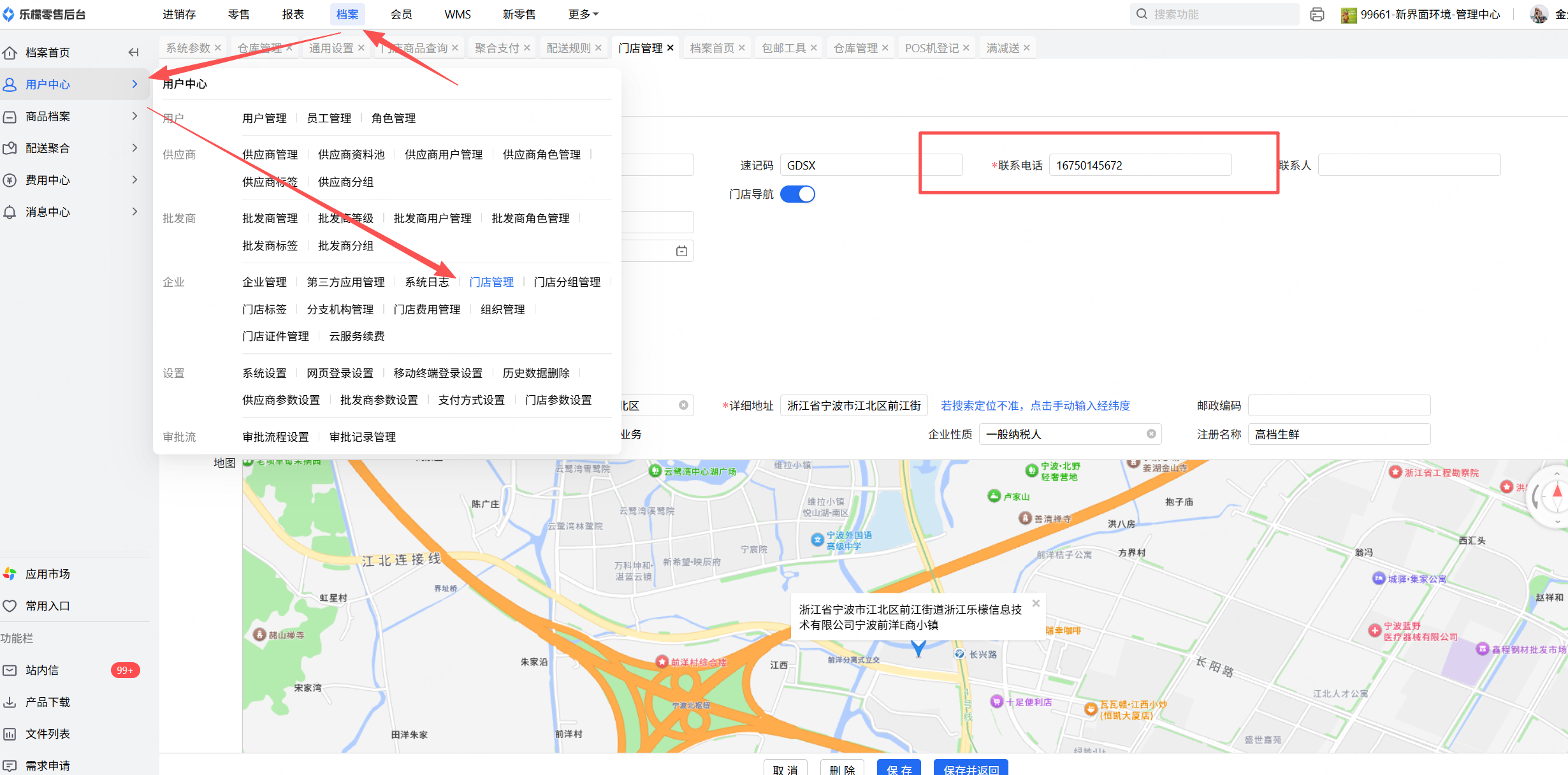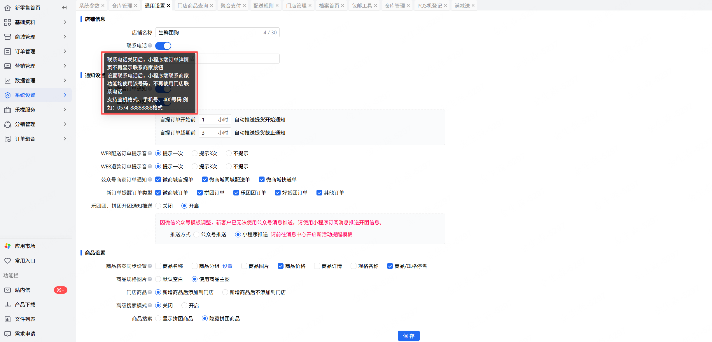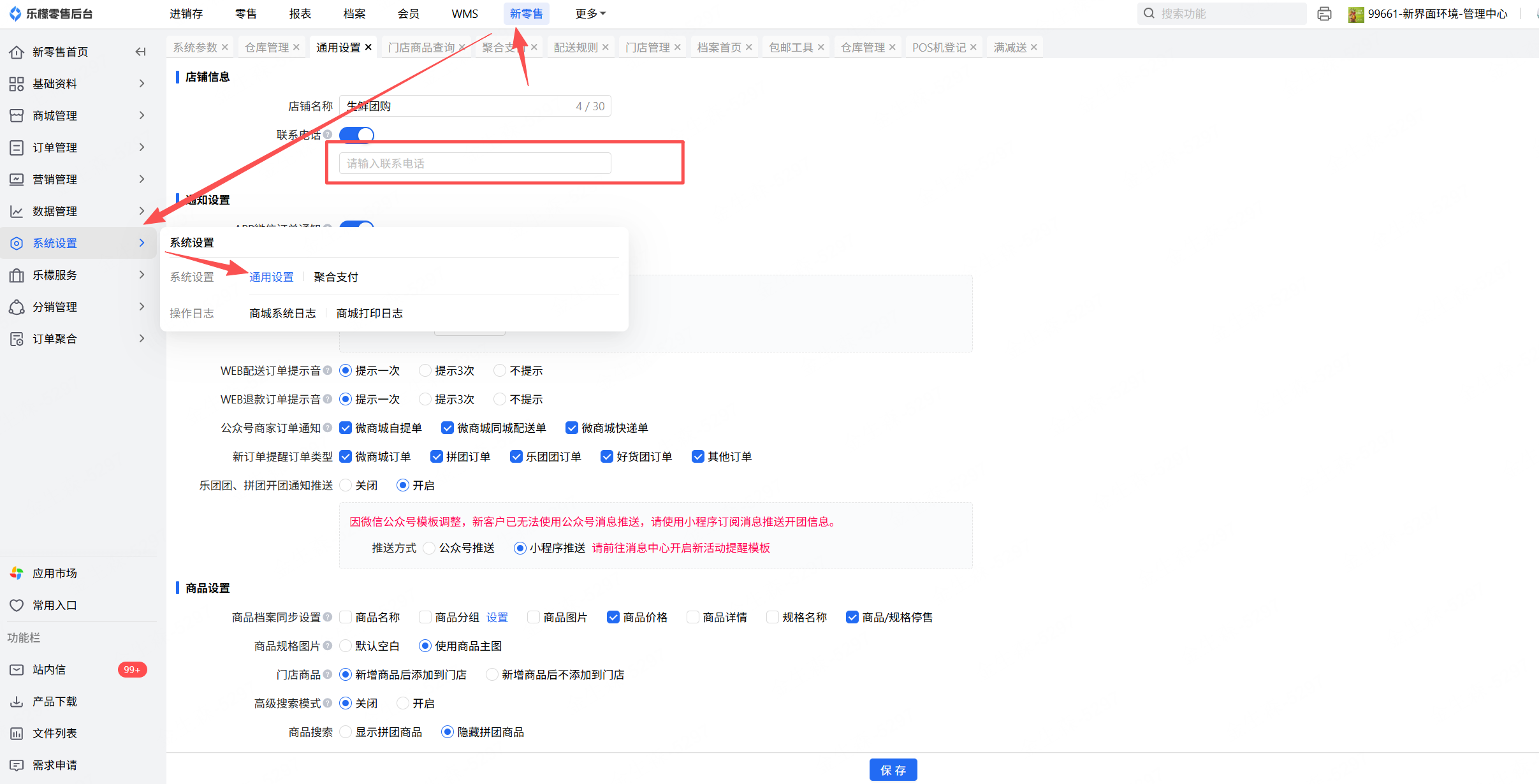 👉【操作路径】:新零售-系统设置-通用设置-店铺信息-联系电话