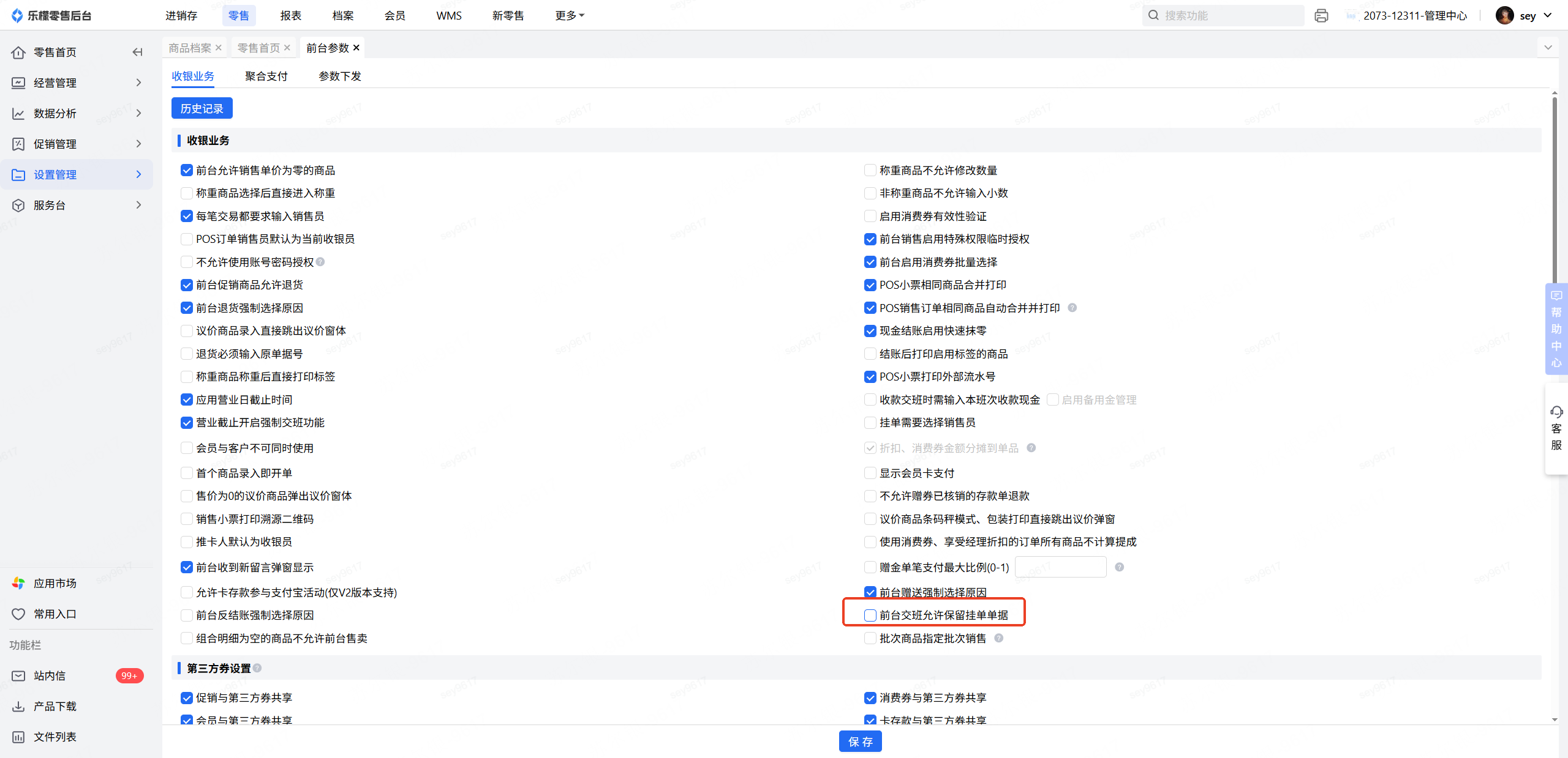 还有档案-前台参数 前台交班允许保留挂单单据 有没有勾选
