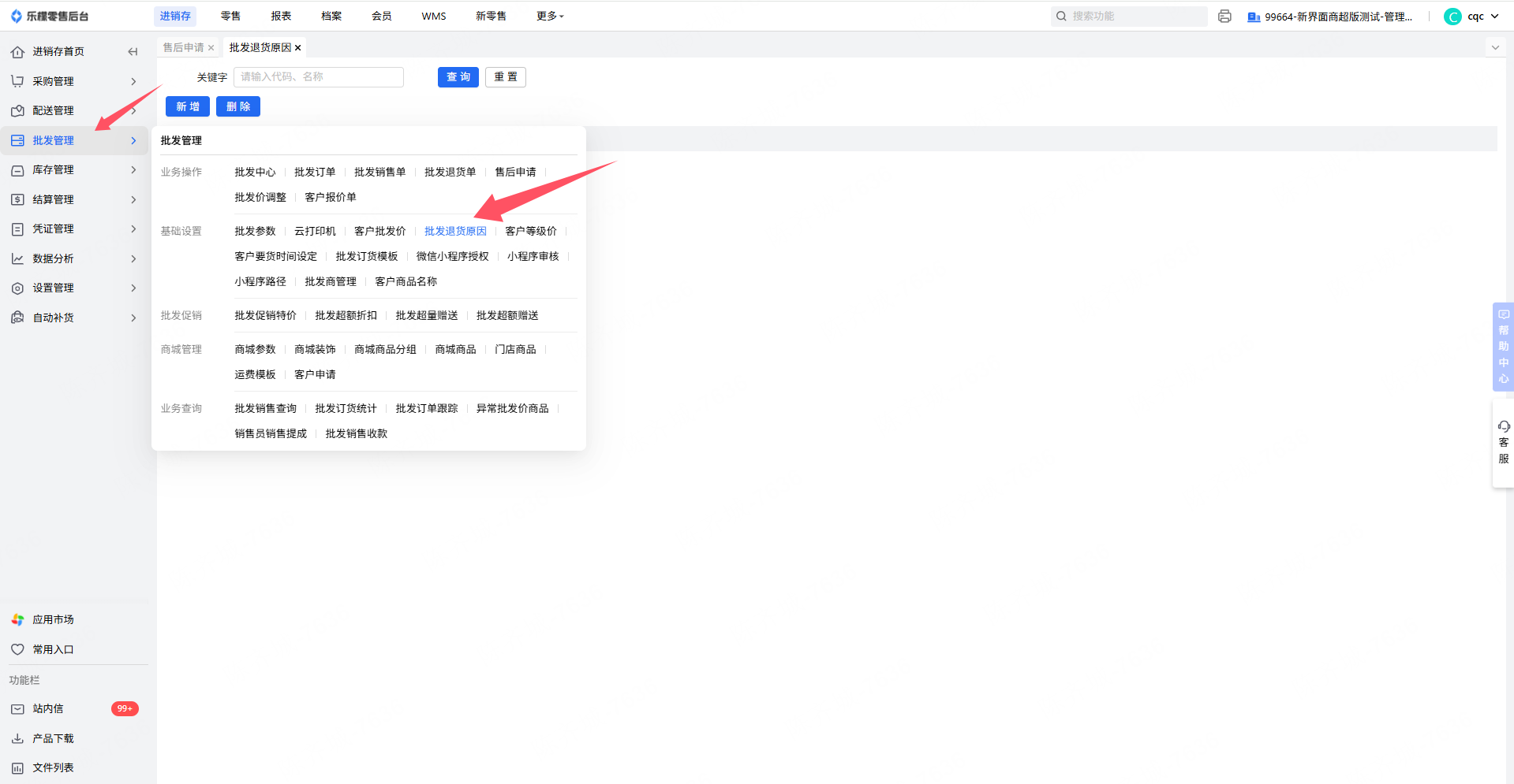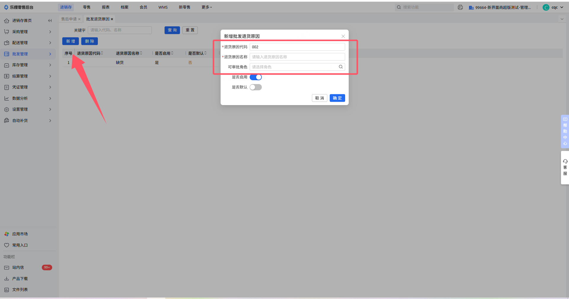 👉【操作路径】:1.进销存-批发管理-基础设置-批发退货原因