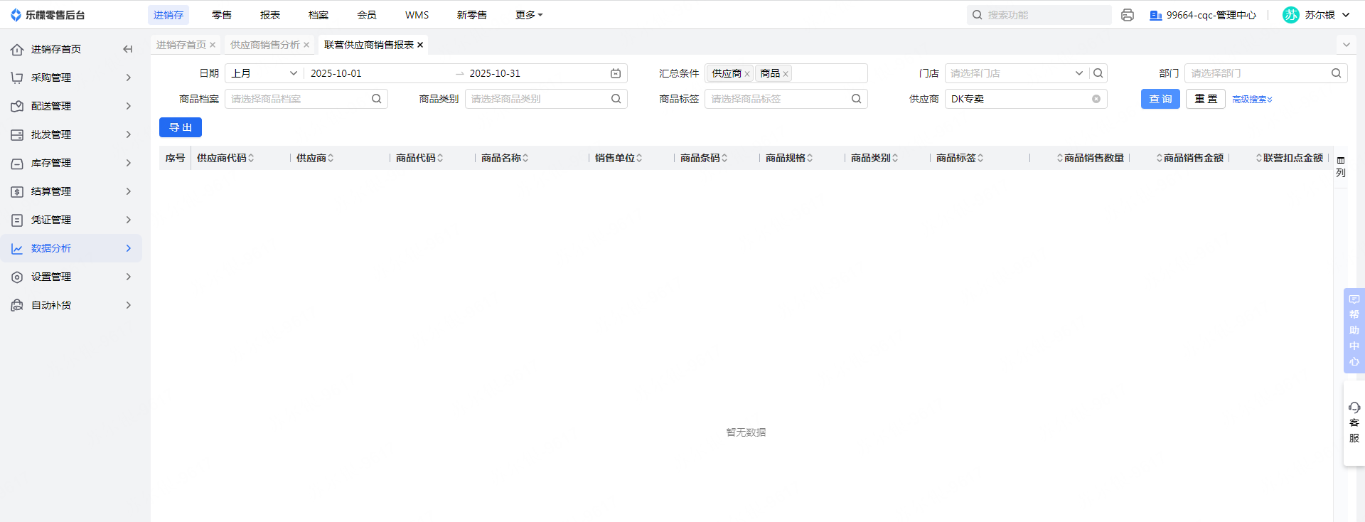 而相同查询条件查询联营供应商销售报表,却没有数据