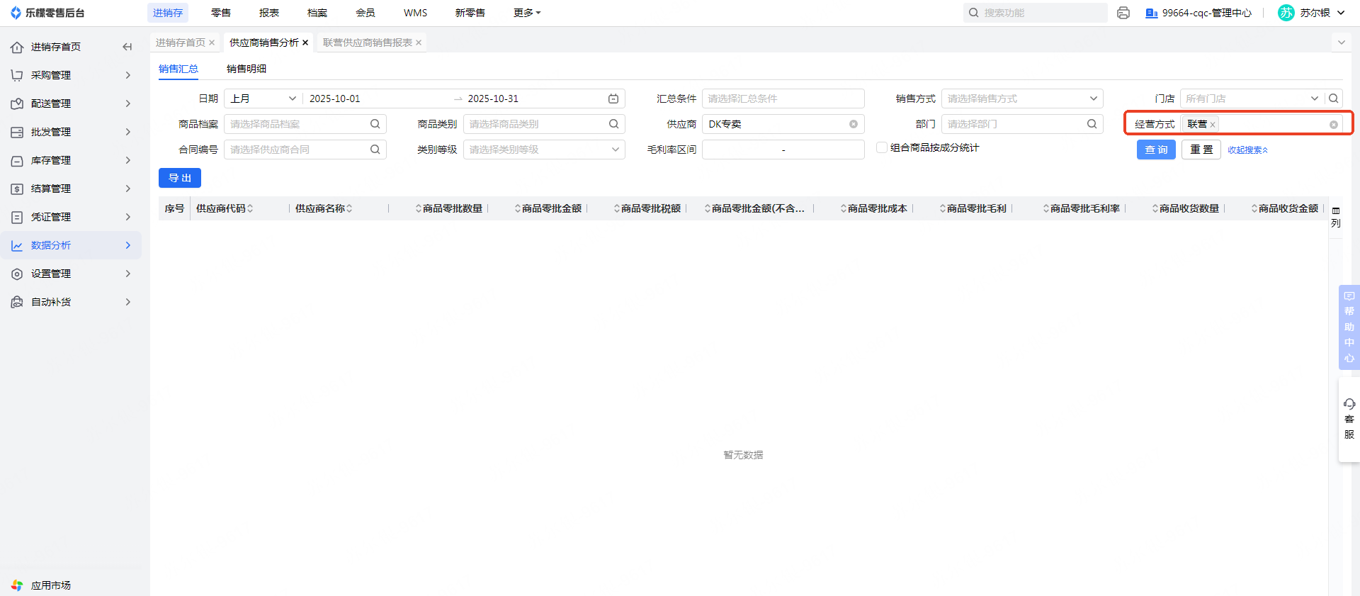 如供应商销售分析,筛选条件“经营方式”只查询联营,也是没有销售数据的