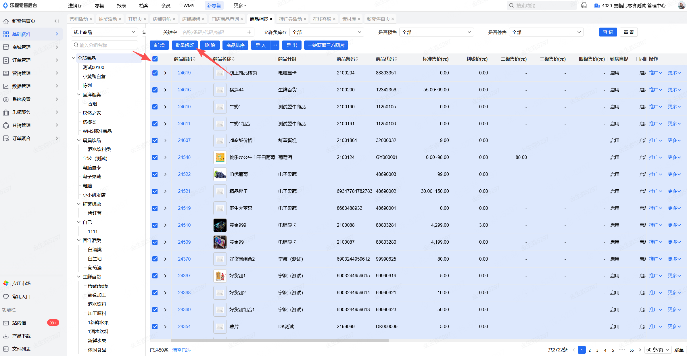 👉【操作路径】:新零售-基础资料-商品档案-批量勾选商品-点击【批量修改】