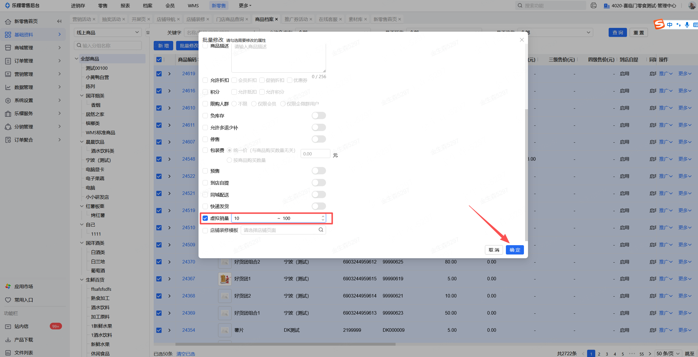 批量修改弹窗里勾选虚拟销量,然后设置随机数量范围区间,最后点击确定即可