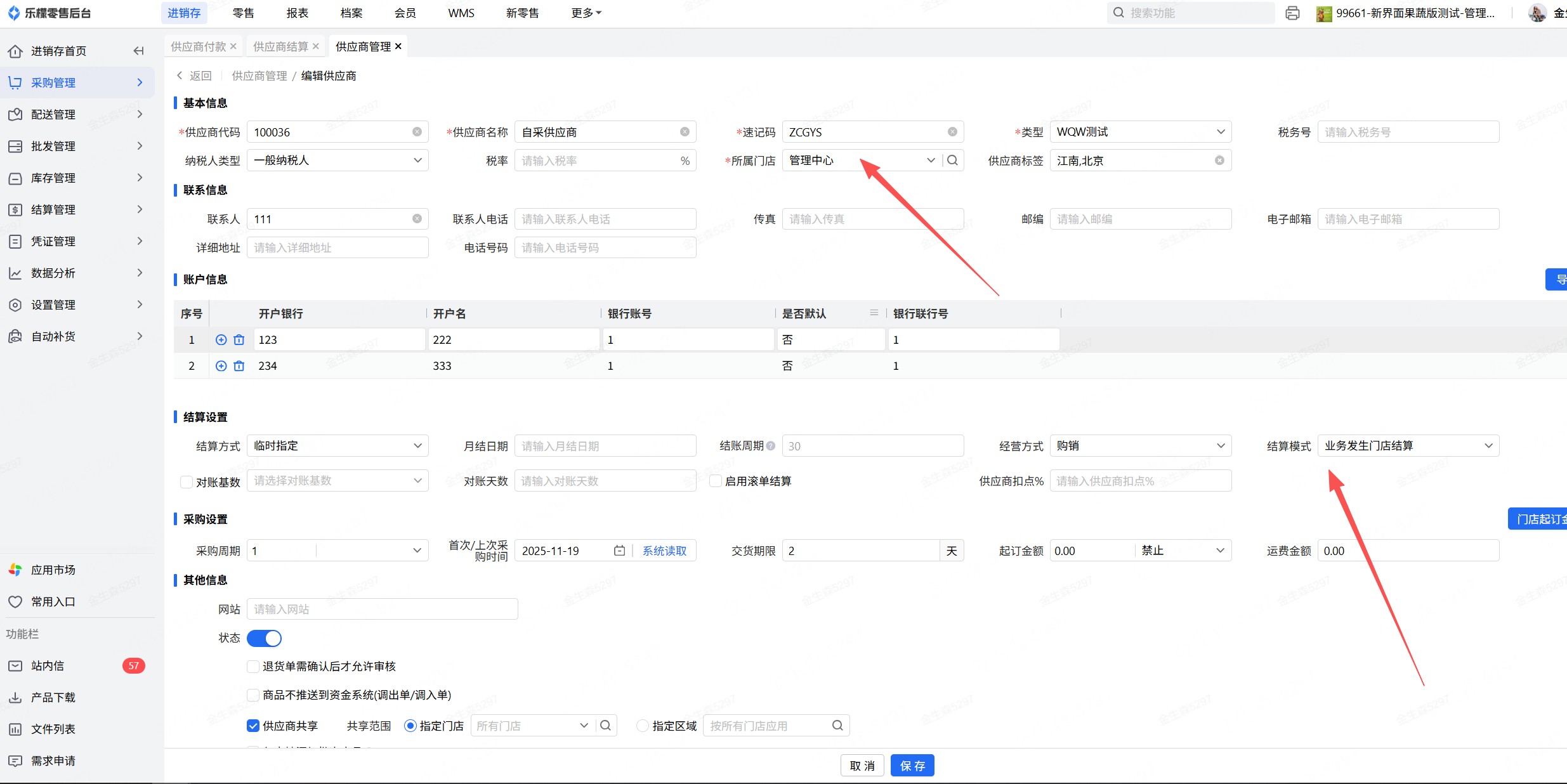 门店如想与供应商进行结算,需要看进销存-采购管理-供应商管理的所属门店及结算方式