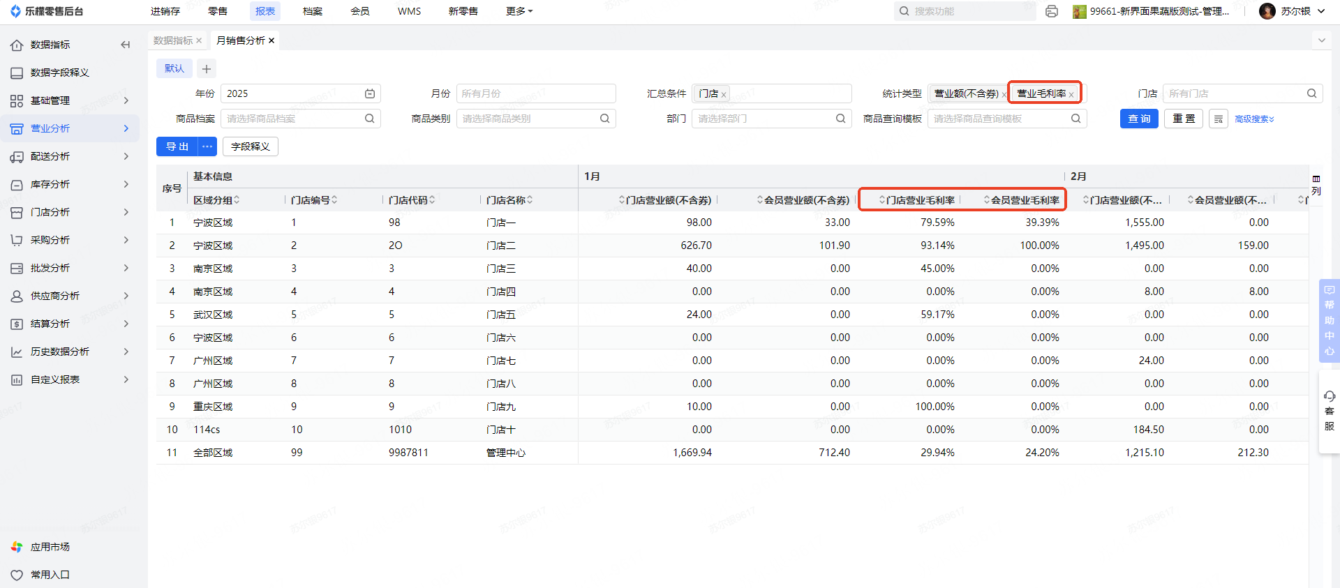 门店 | 营业额、月客单量、月客单价、营业毛利、营业毛利率% | 商品销售金额、商品销售数量、商品销售毛利、商品销售成本 |