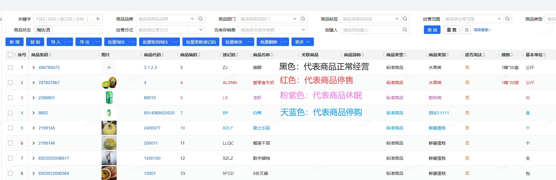 休眠商品显示粉紫色:代表商品暂时禁止门店要货了,一般适用于季节性商品