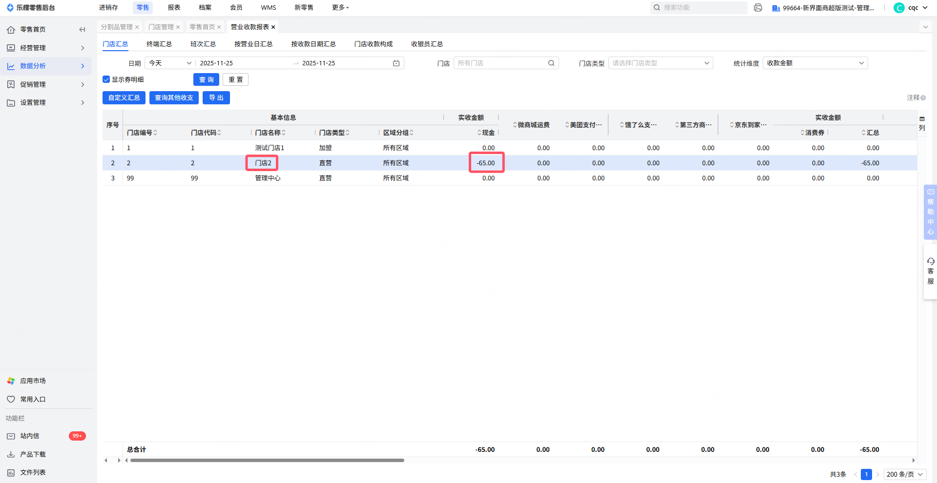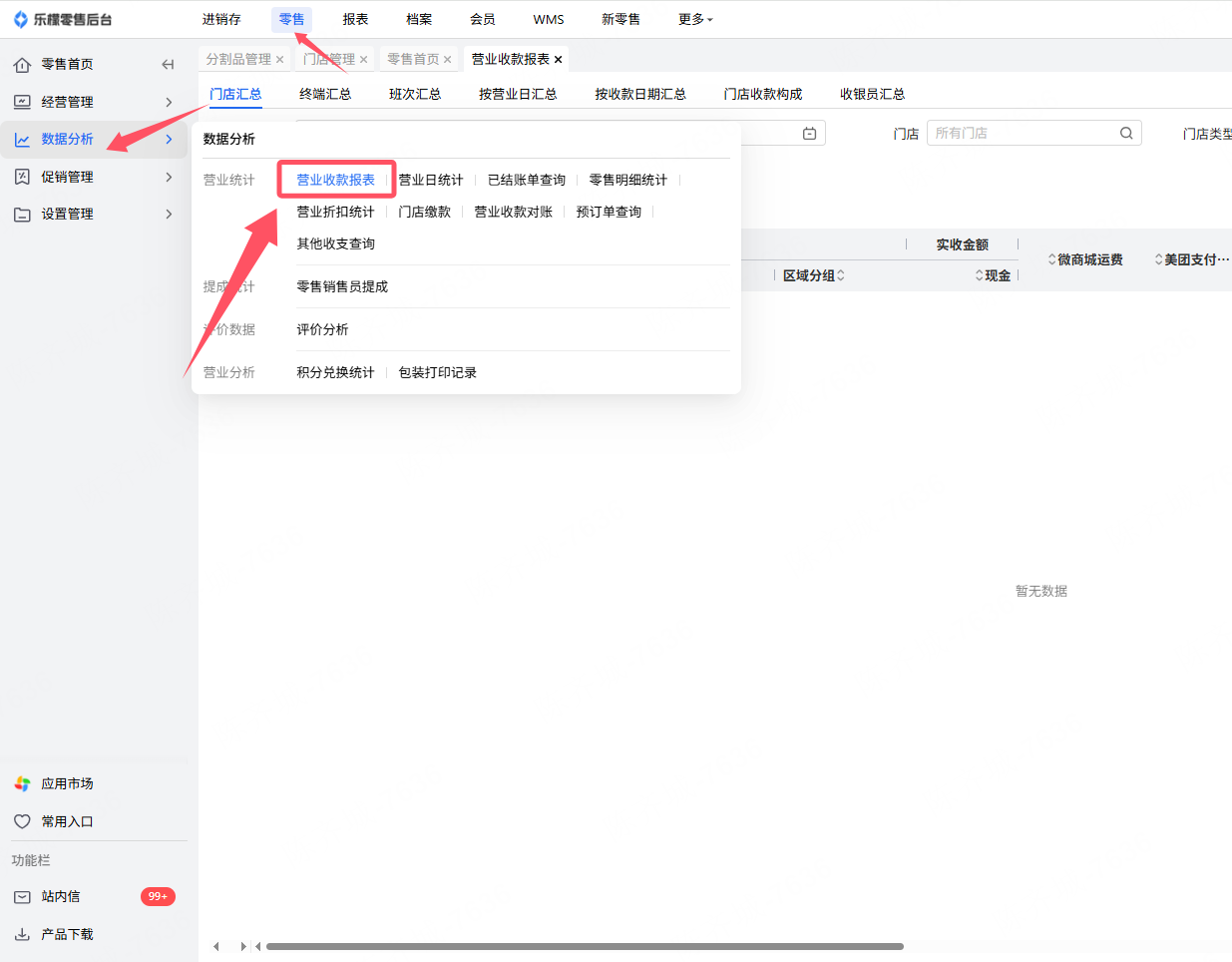 👉【操作路径】:·零售-数据分析-营业收款报表