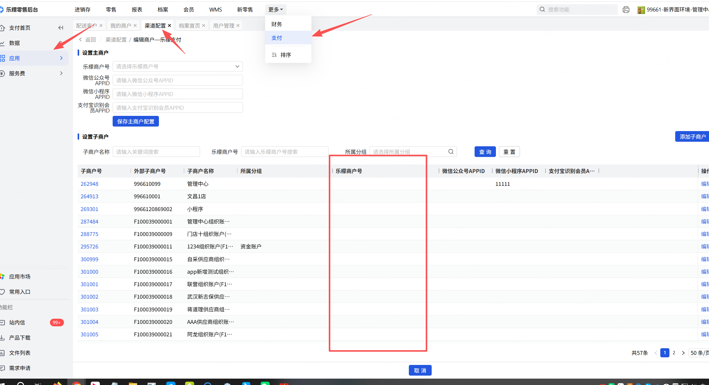 先获取开发票的乐檬商户号,点击乐檬支付-应用-渠道配置,查询对应的乐檬商户号