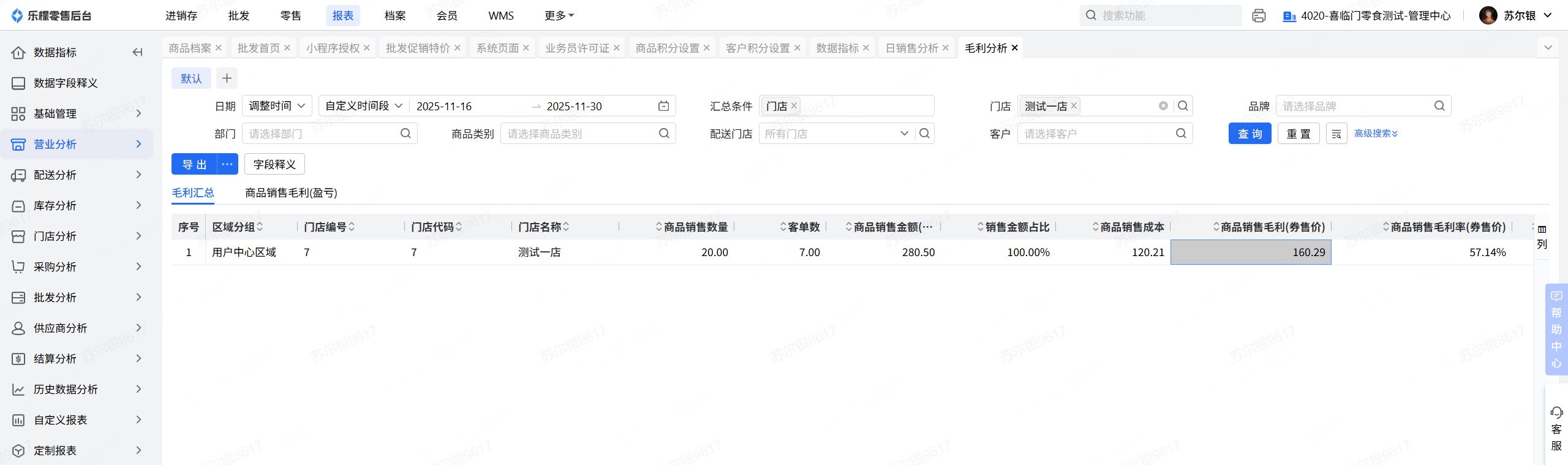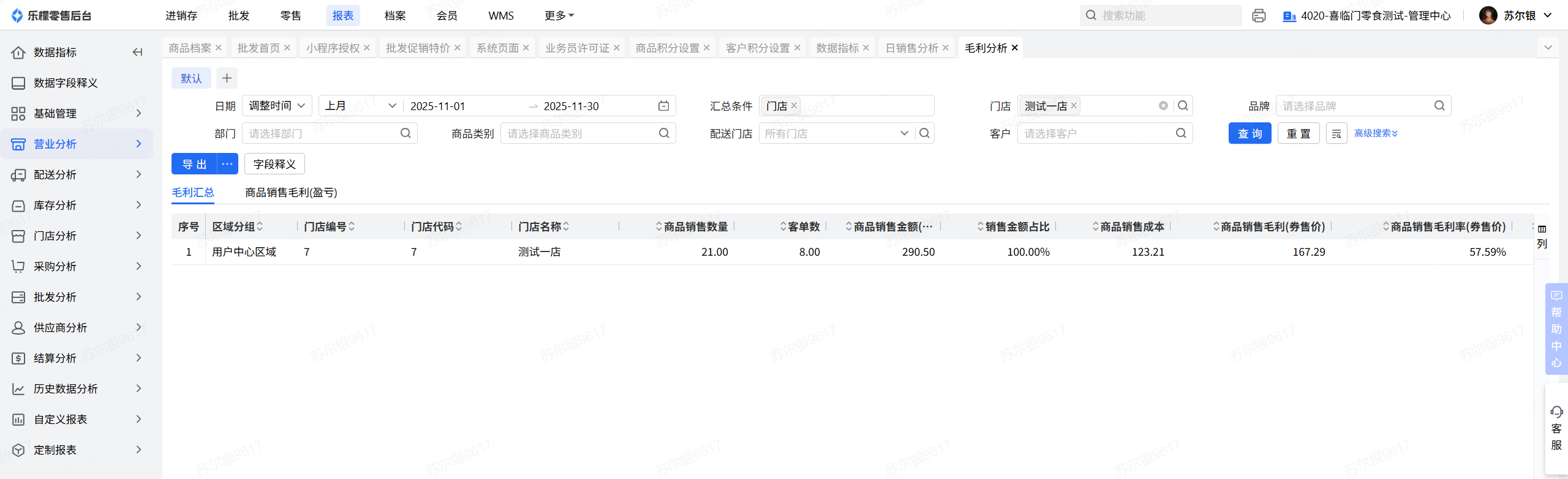查询某一门店11.1~11.30日的商品销售毛利为:167.29