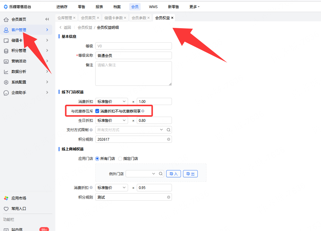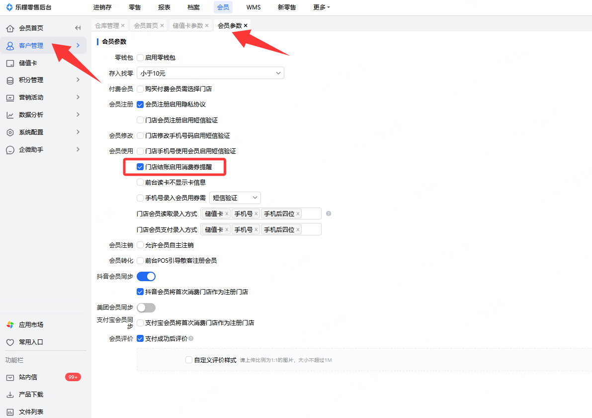 👉【操作路径】:·乐檬零售-会员-客户管理-会员参数-勾选前台参数启用消费券提醒