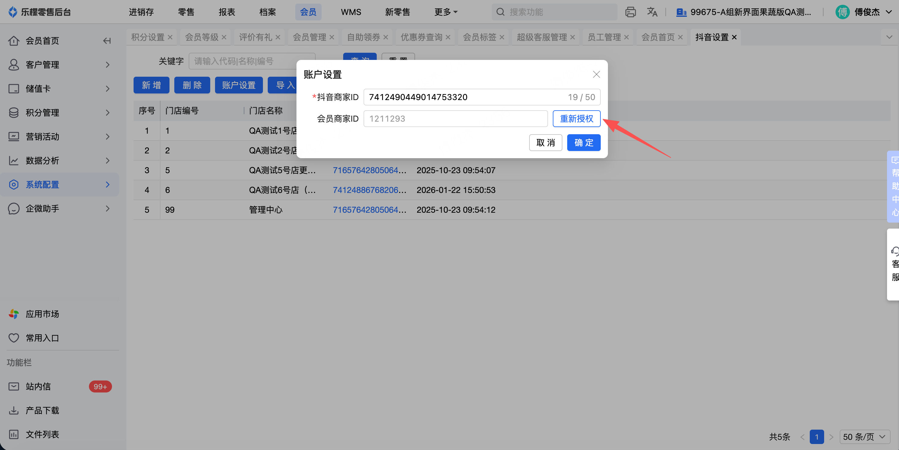 4、两个账套号不能保存同一个商户id(一个抖音商户id在一个账套号下保存过一次后,其他账套号再保存不会成功,抖音会员同步只会同步到第一个账套号下