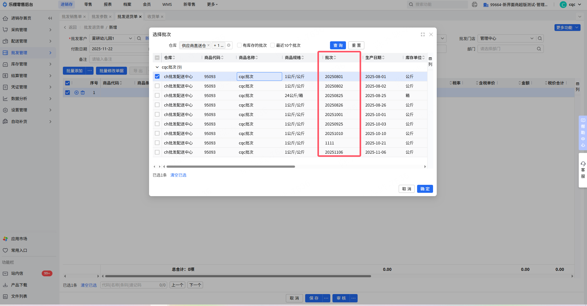 例如批发退货单退货时,想选择去年的批次进行退货,发现未显示有去年的批次