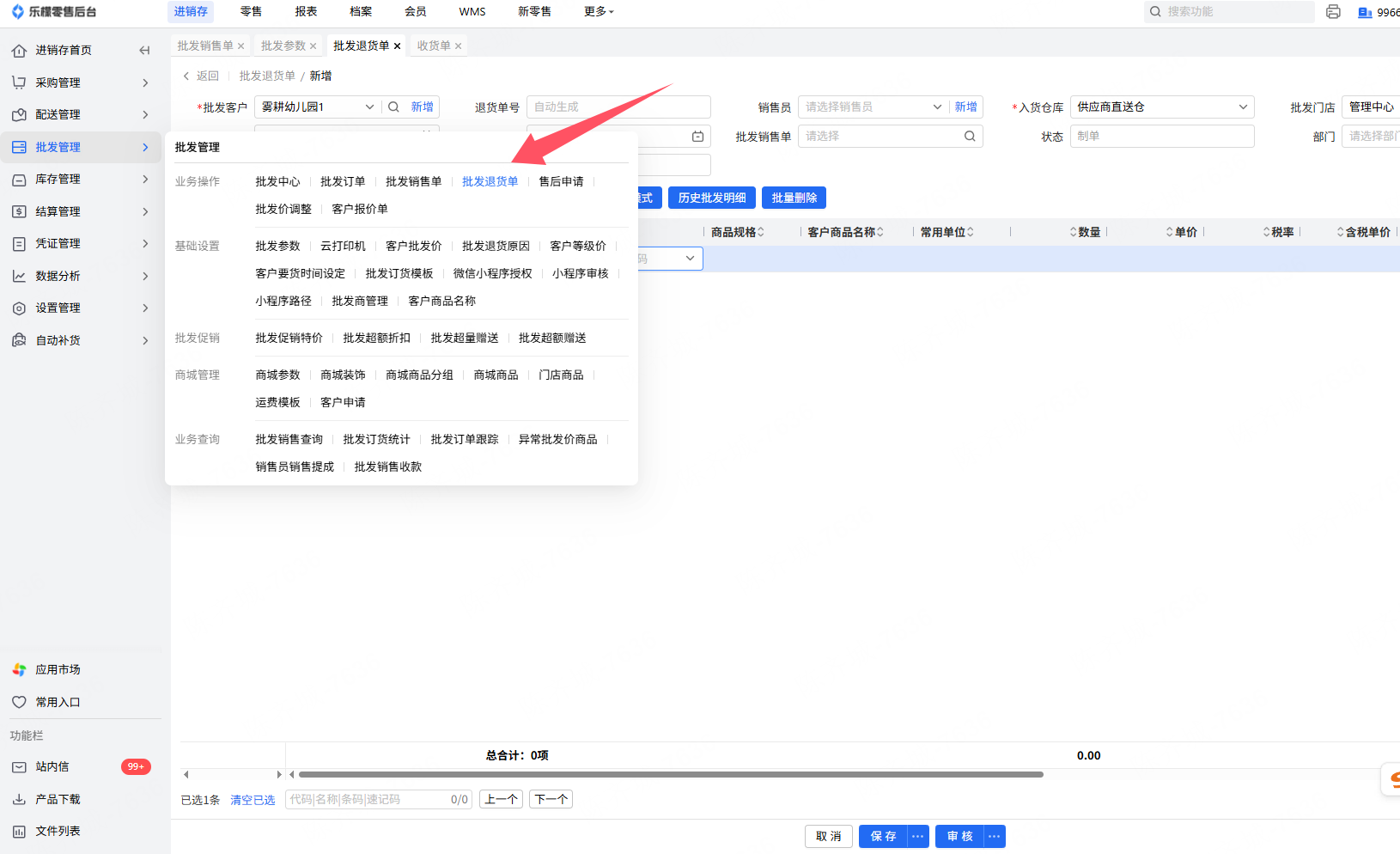 👉【操作路径】:进销存-批发管理-业务操作-批发退货单