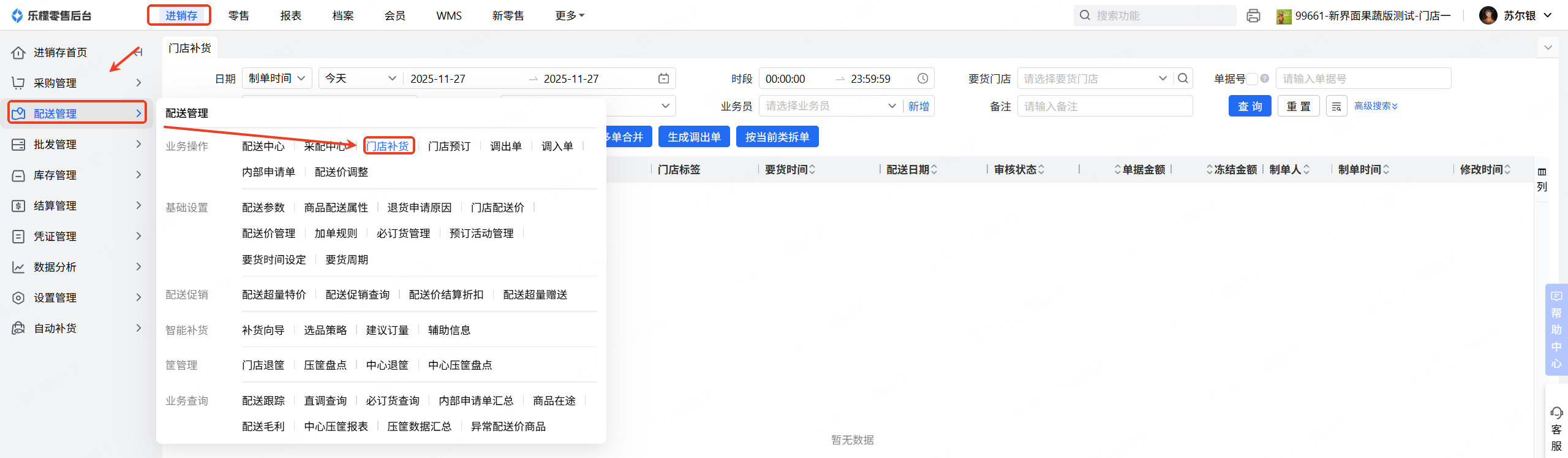 👉【操作路径】:进销存-配送管理-门店补货