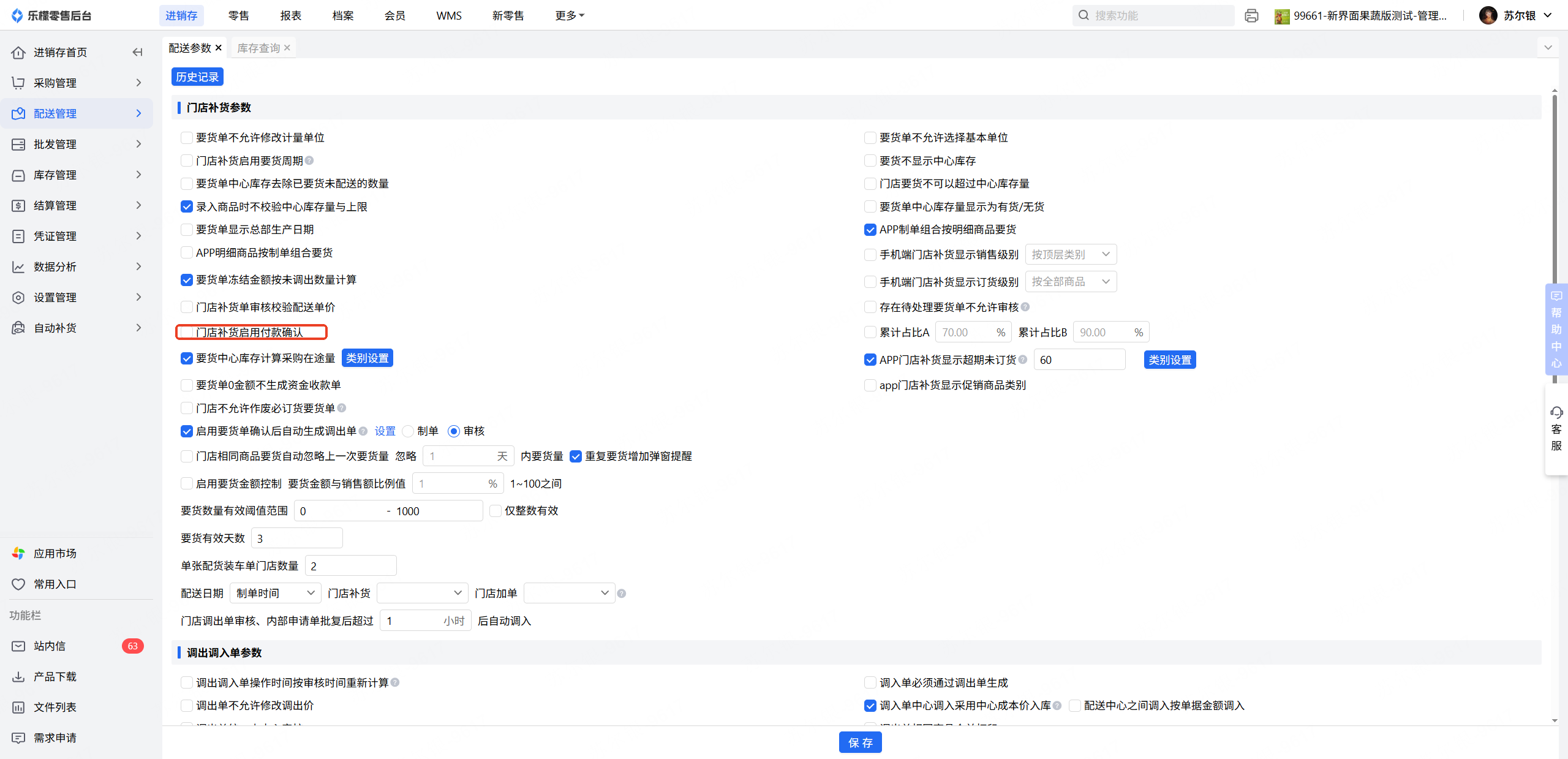 对应没上资金系统的客户来说,想管控门店要货需先付款,可开启配送参数:门店补货启用付款确认