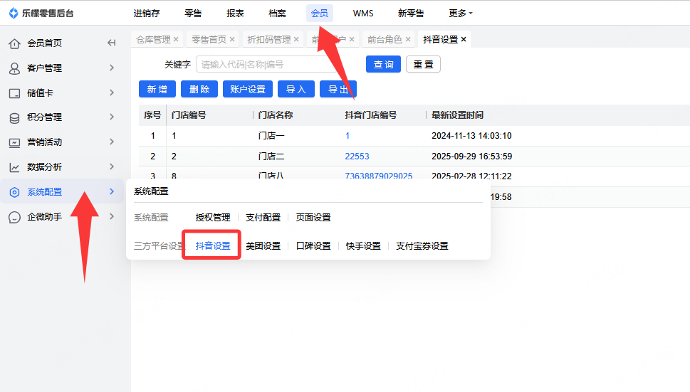 👉【操作路径】:·会员-系统配置-三方平台设置-抖音设置 新增对应的 抖音门店编号和门店编号后保存 前台数据同步就会显示