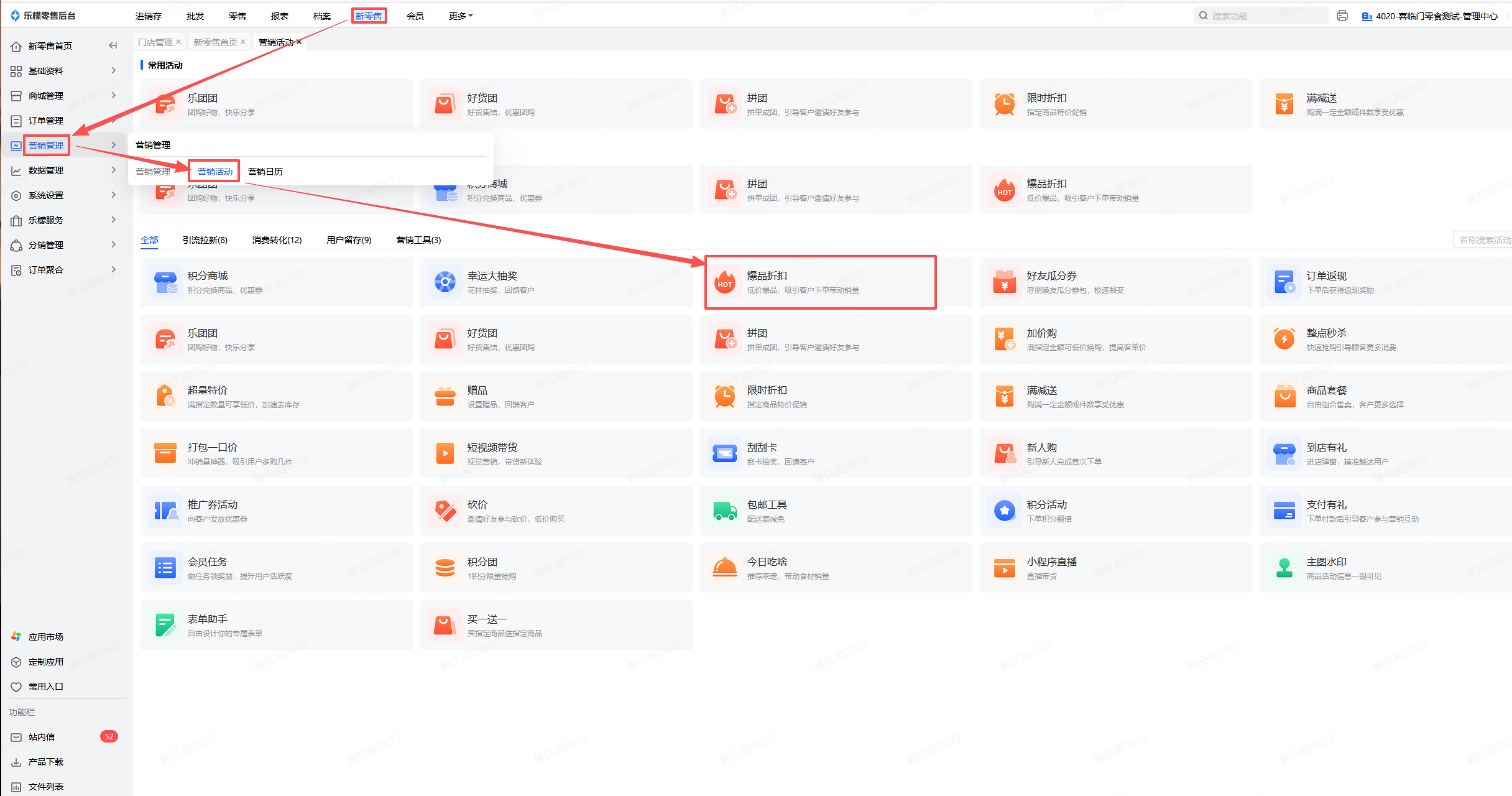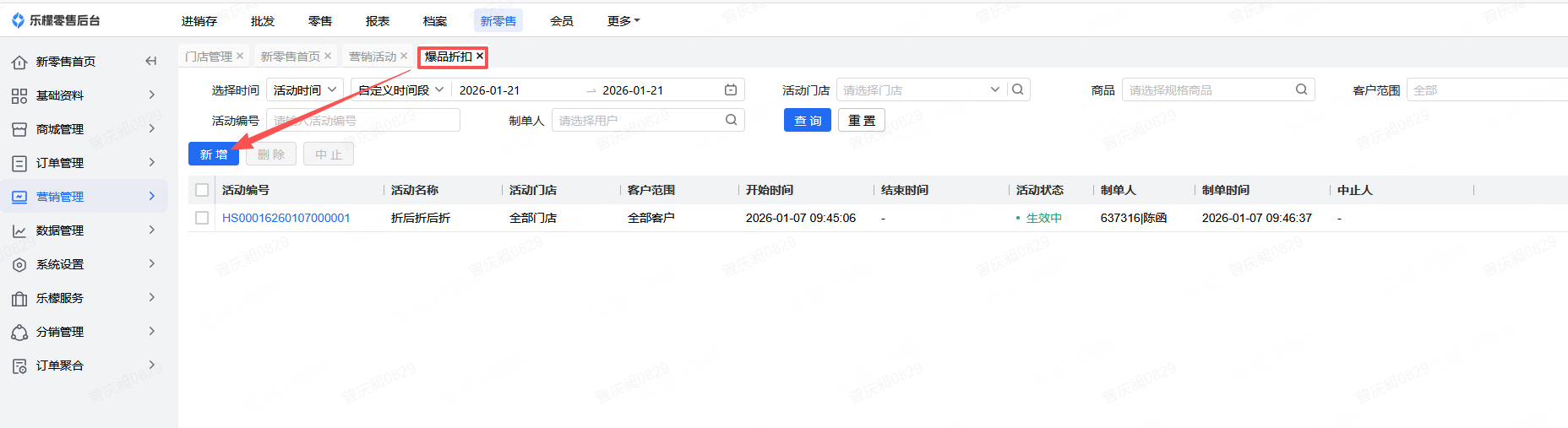 👉【操作路径】:新零售-营销管理-营销活动-爆品折扣-新增