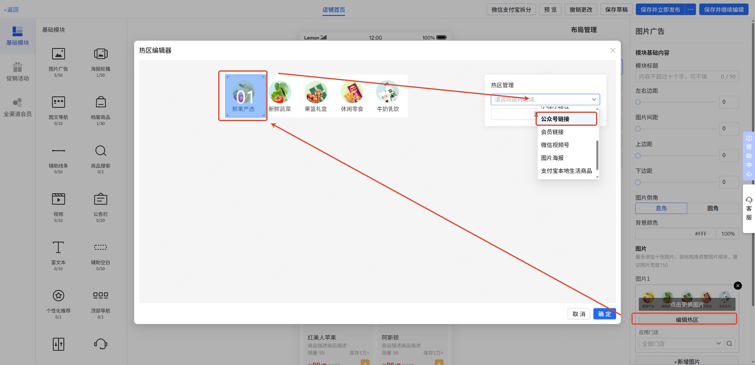 新零售-商城管理-店铺装修,设置图文广告-跳转公众号链接,把在公众号复制的链接粘贴到内即可