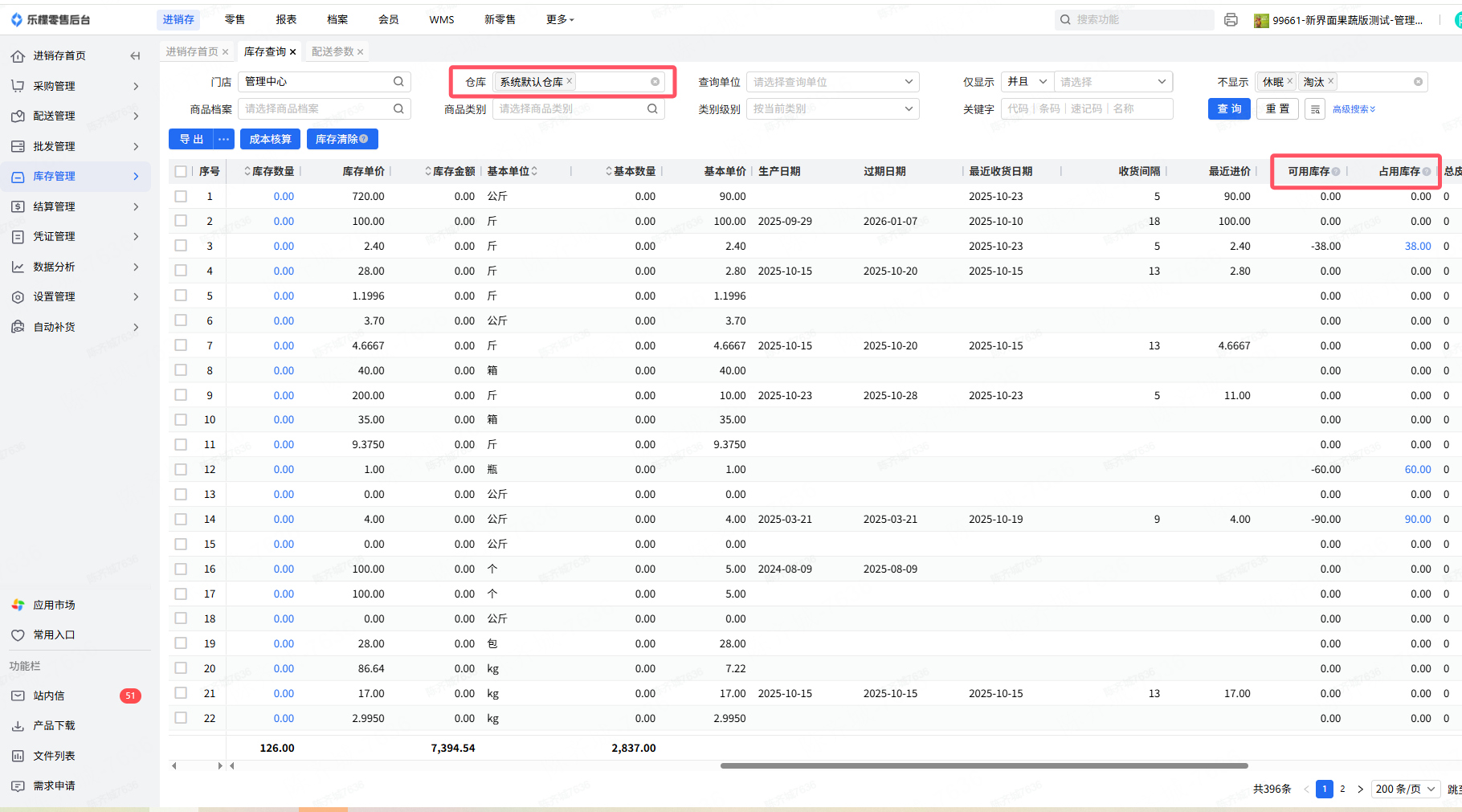 注意:库存查询需要选择仓库才能查询到可用库存数量、占用库存数量