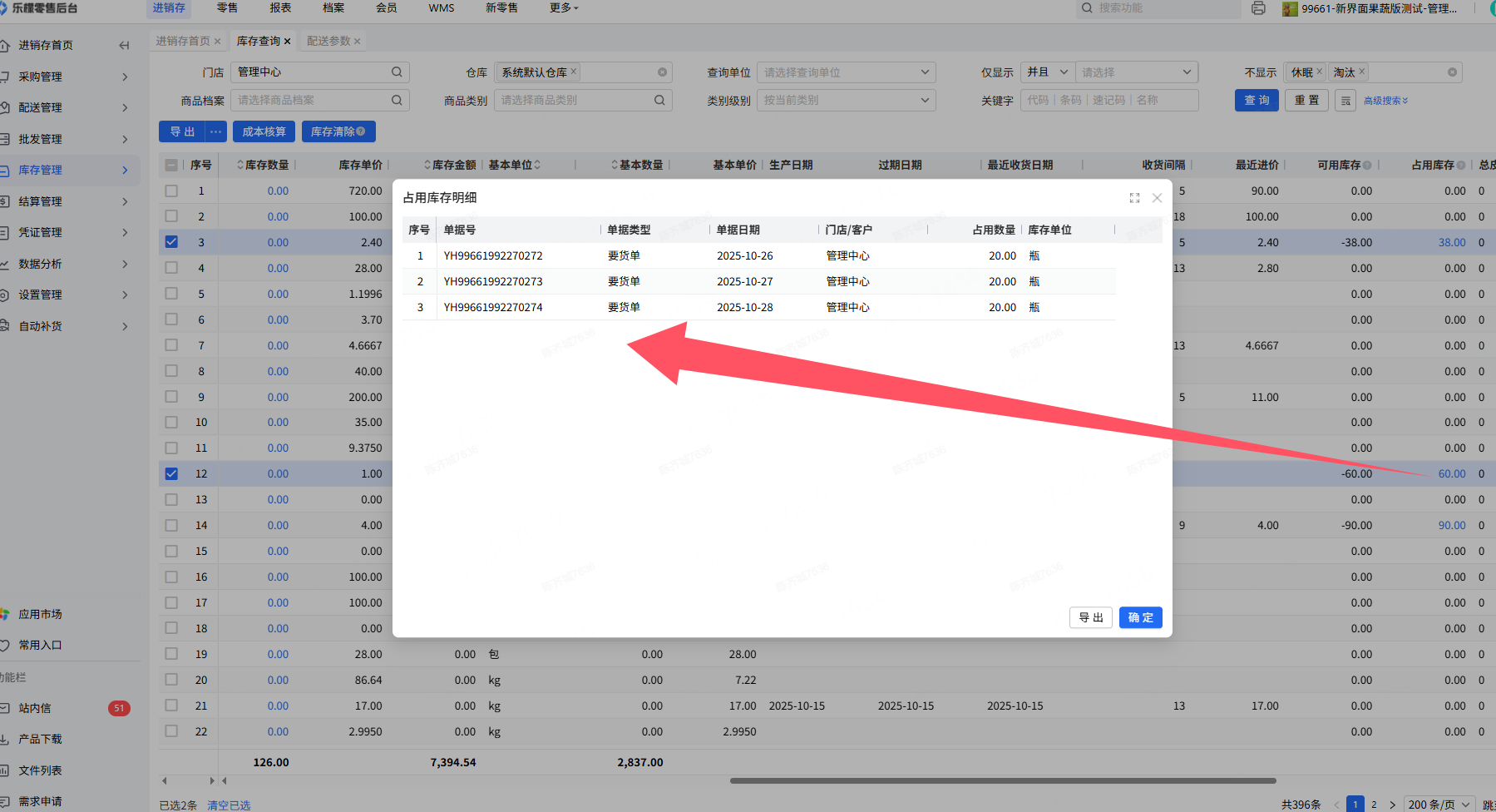 库存查询,可以查询可用库存数量、占用库存数量及对应单据
